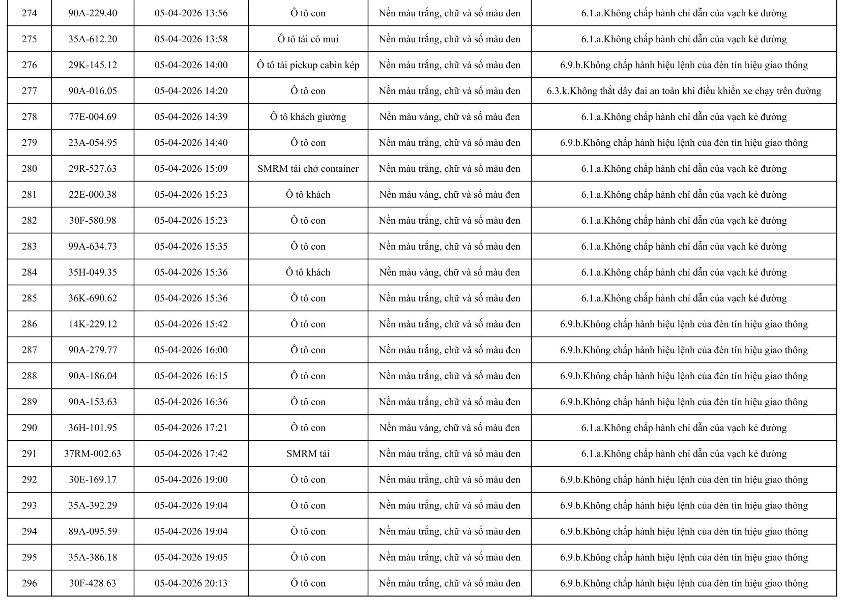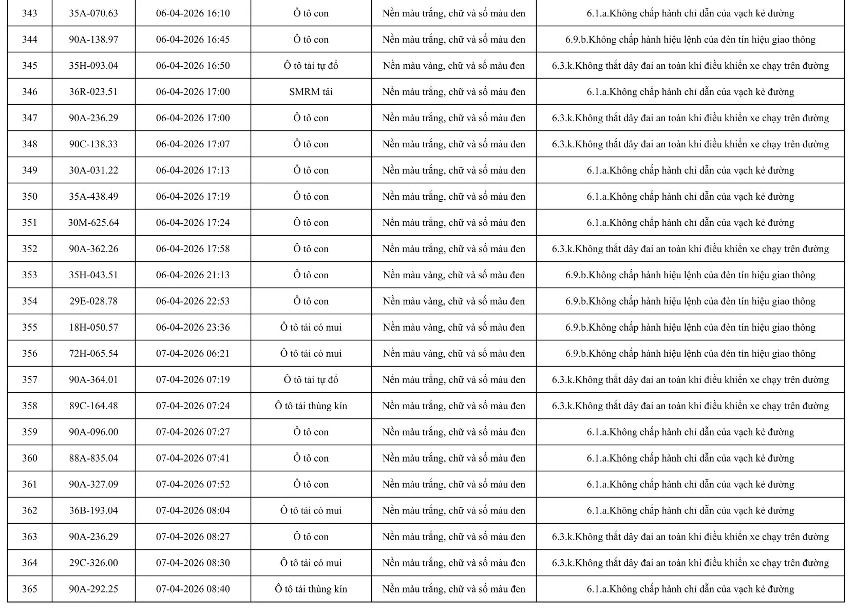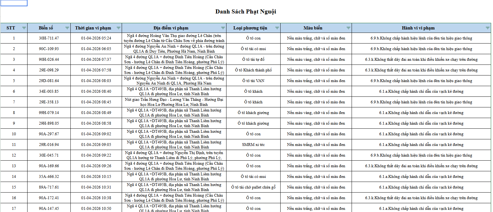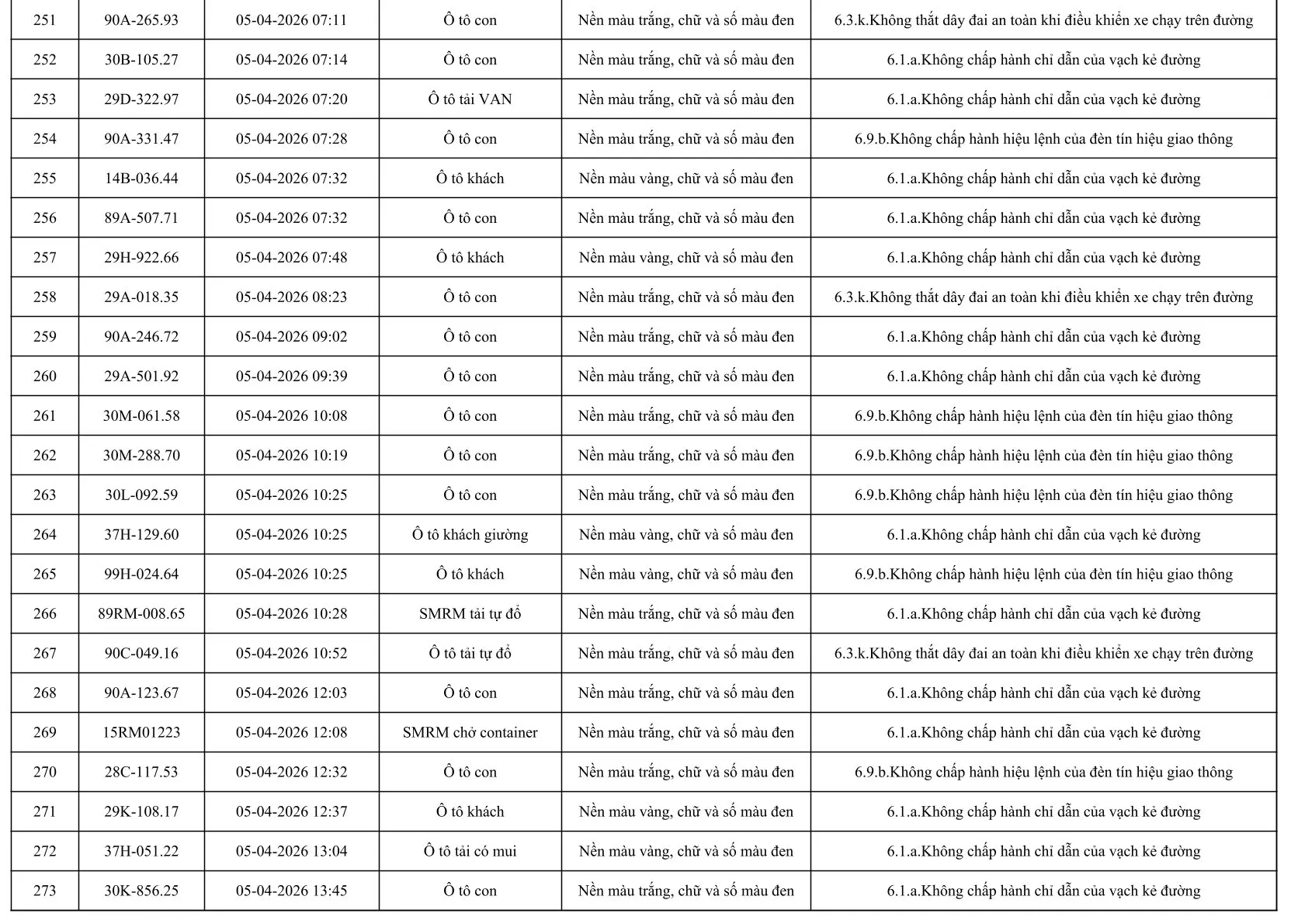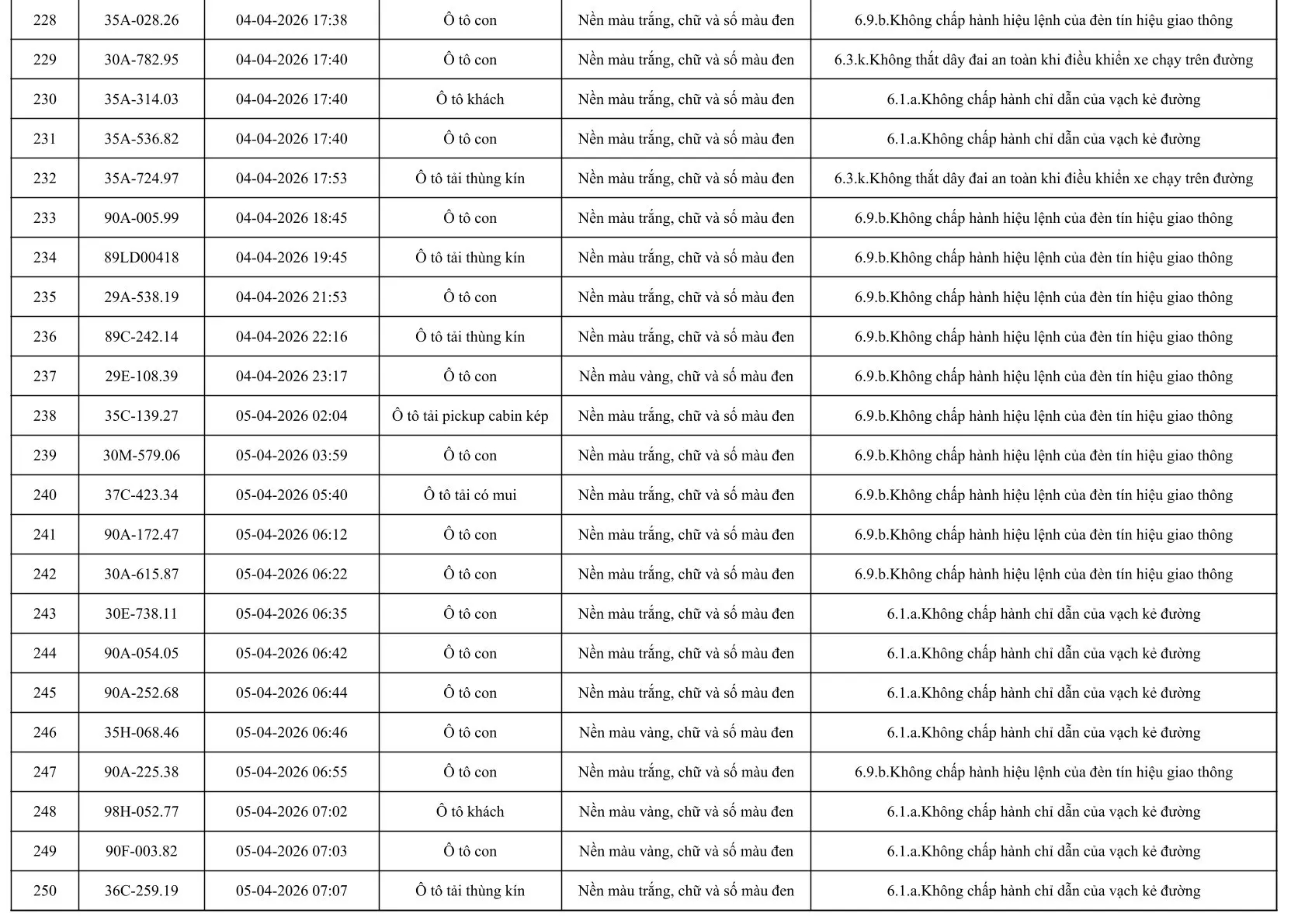 Sau đây là danh sách các phương tiện giao thông vi phạm: Xem tại đây!