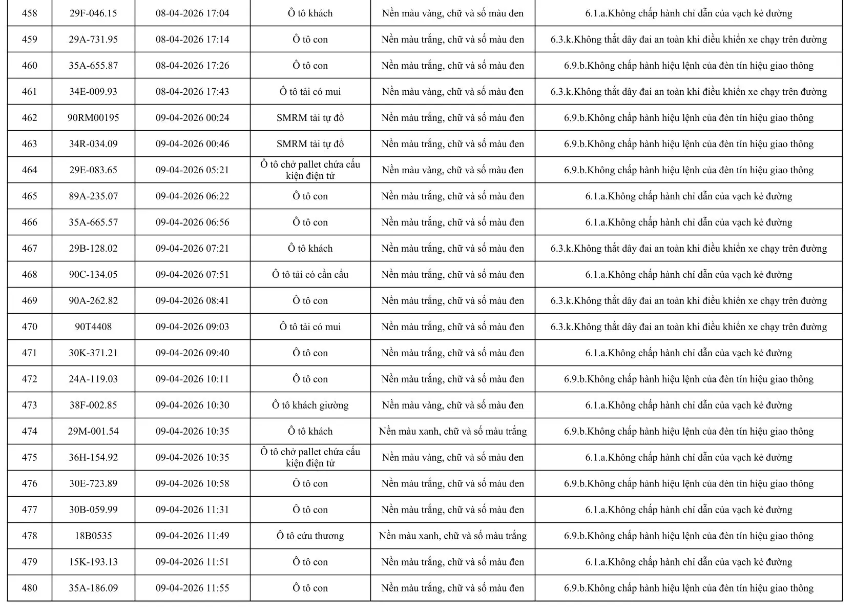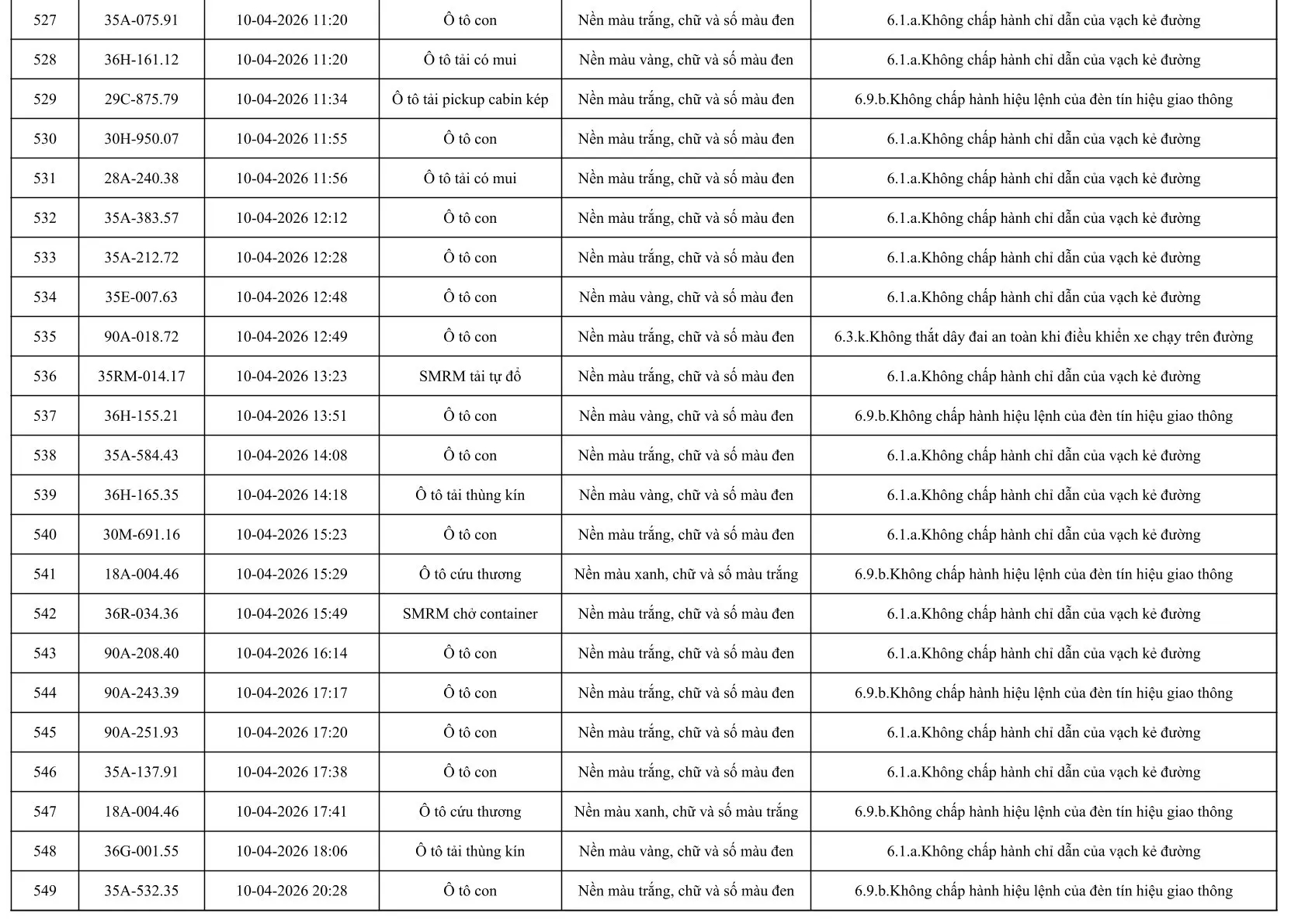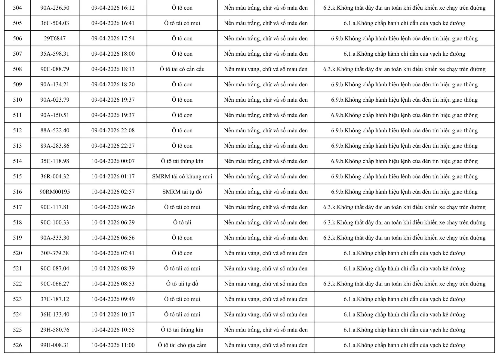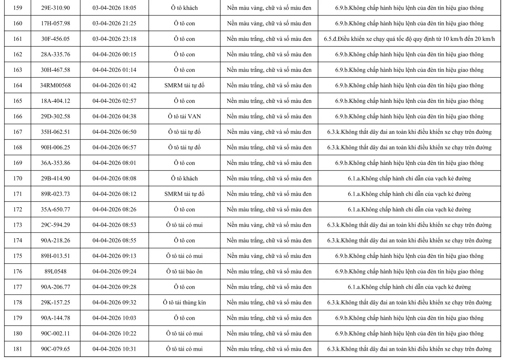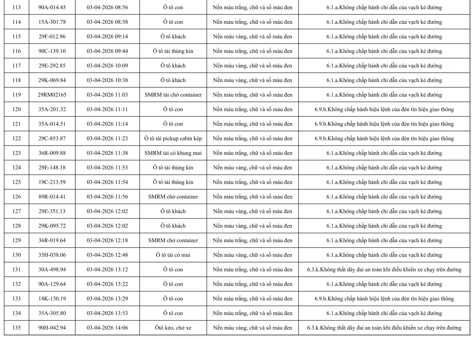 Sau đây là danh sách các phương tiện giao thông vi phạm: Xem tại đây!