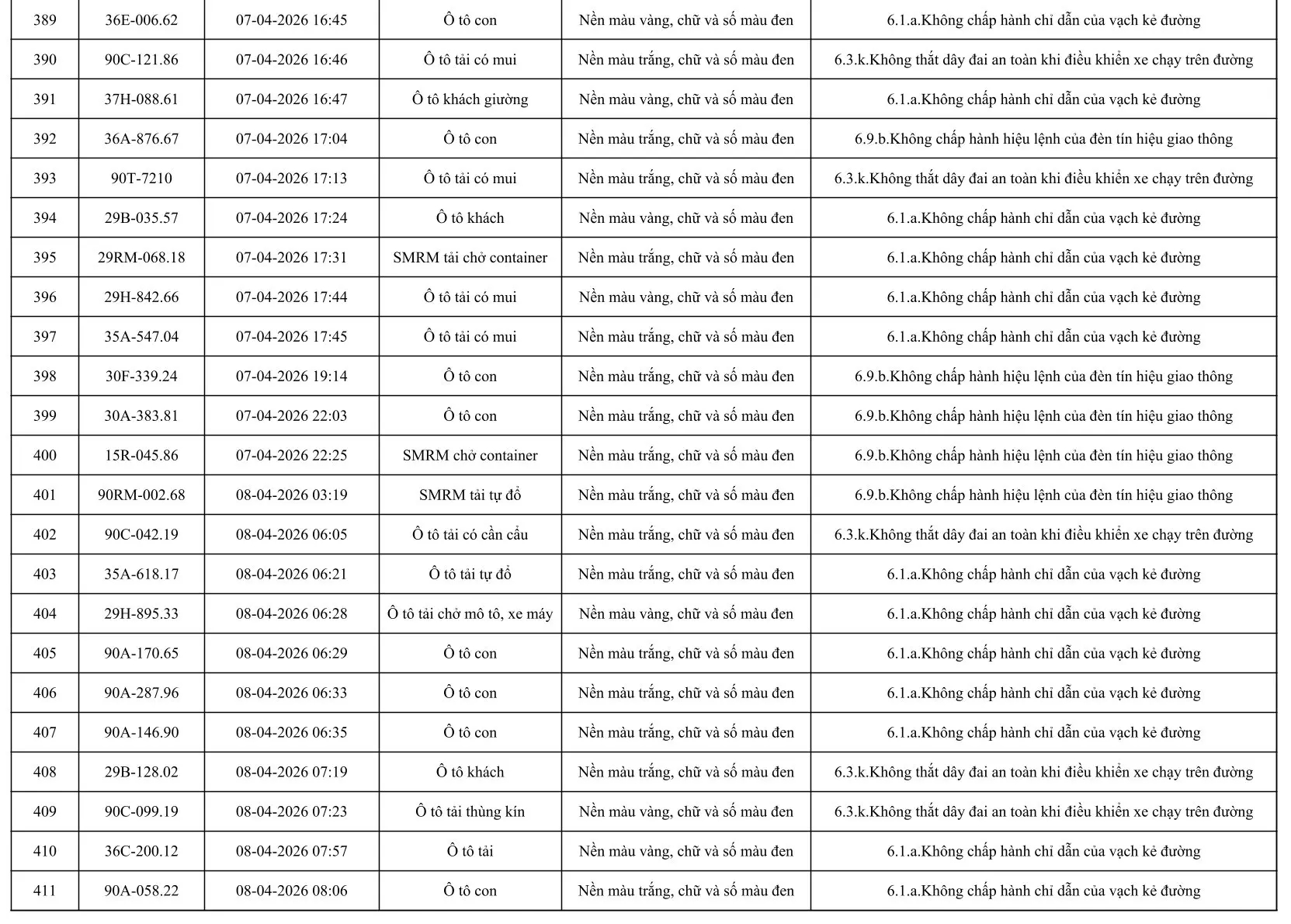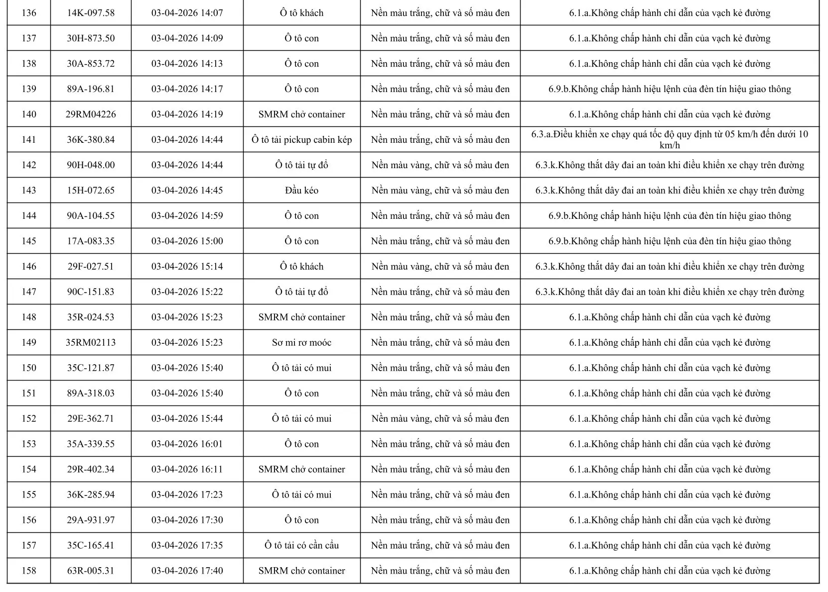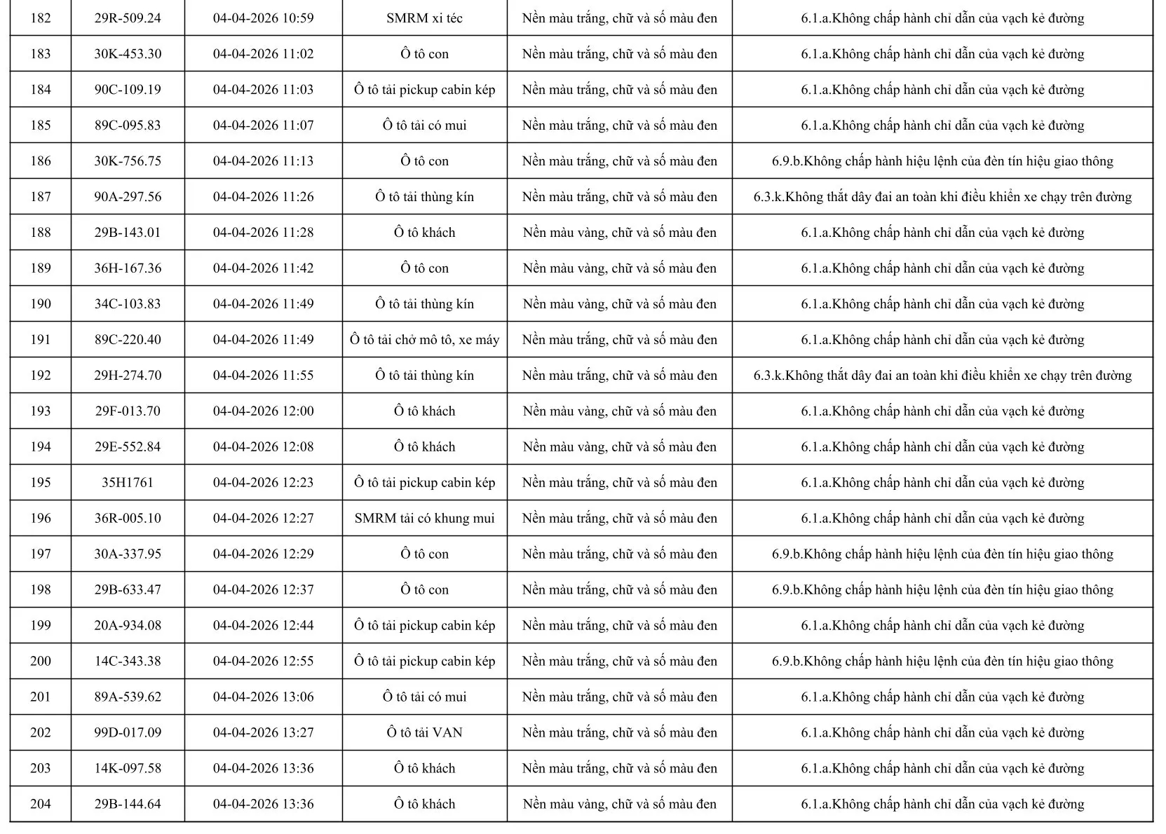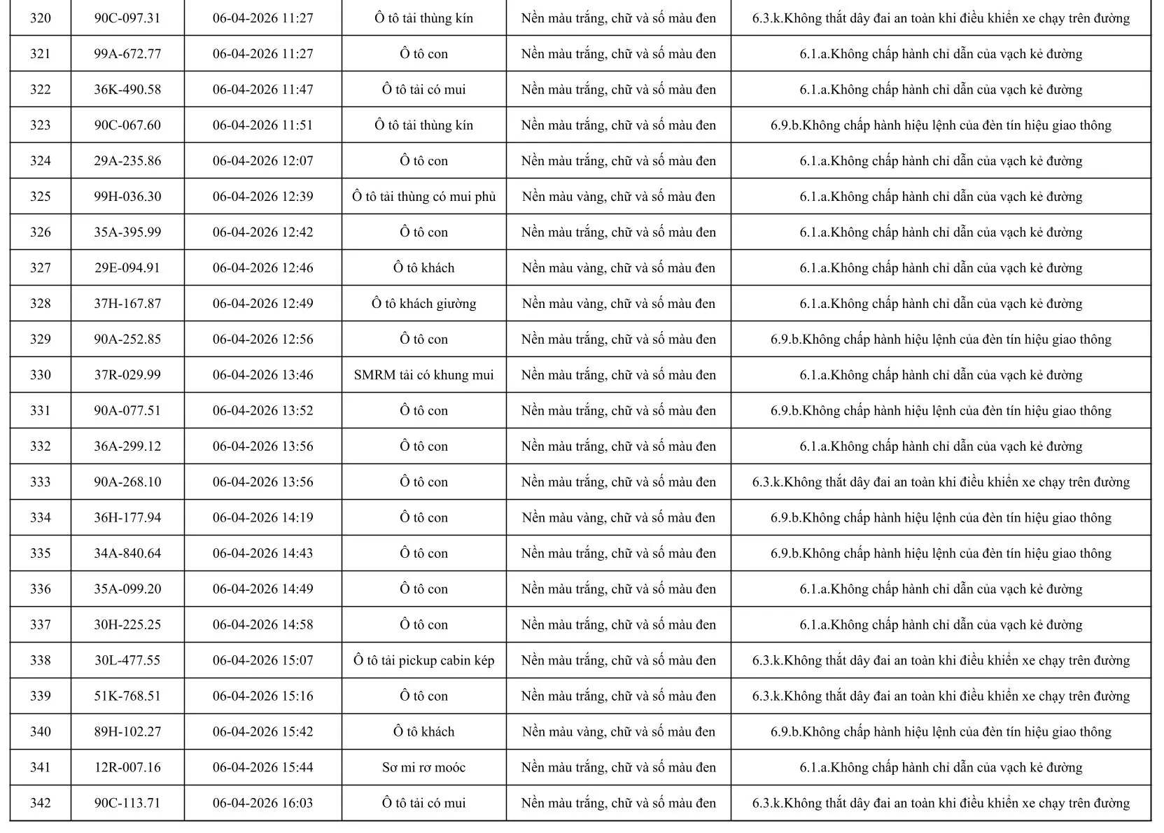 Sau đây là danh sách các phương tiện giao thông vi phạm: Xem tại đây!