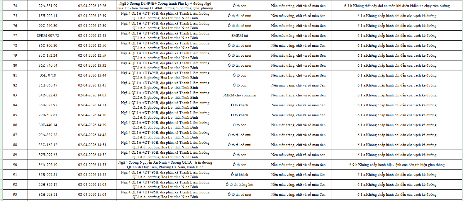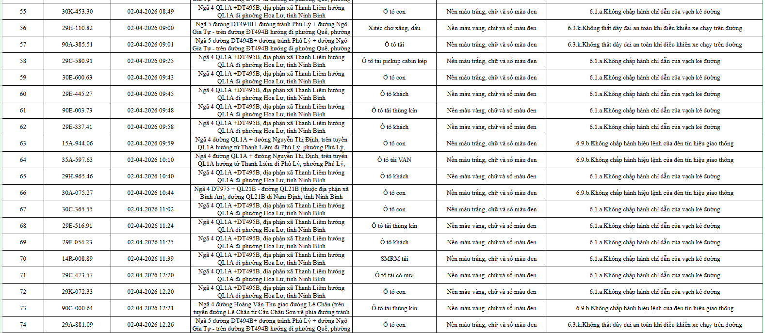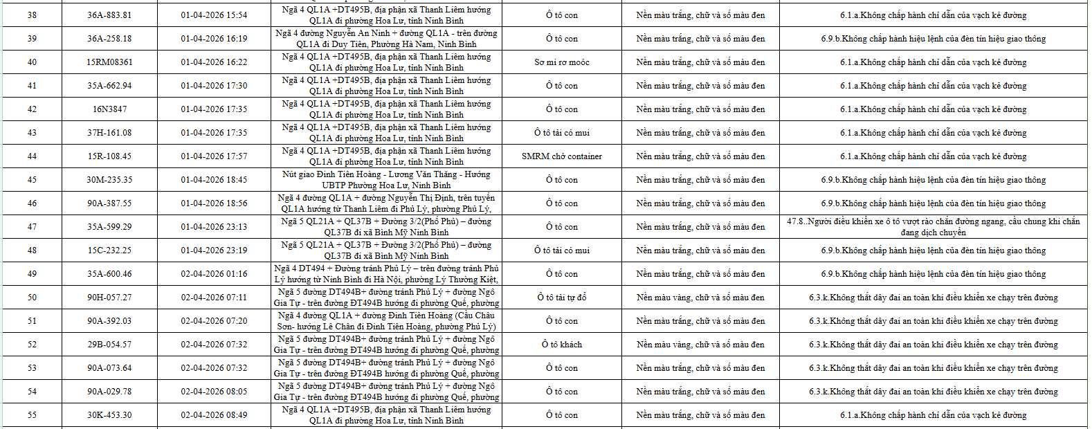 Phòng Cảnh sát giao thông Công an tỉnh Ninh Bình công bố danh sách 553 ô tô bị phạt nguội trong 10 ngày, từ 1 đến 10/4.
