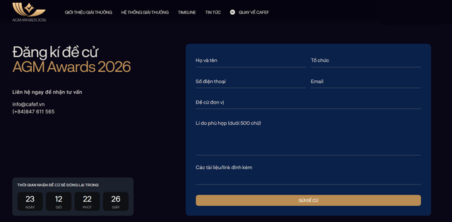 Doanh nghiệp quan tâm có thể truy cập https://cafef.vn/agm-awards.chn hoặc liên hệ trực tiếp để được hướng dẫn và tư vấn hoàn thiện hồ sơ qua email info@cafef.vn hoặc số điện thoại (+84) 847 611 565 (Ms. Linh).
