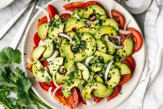 Bơ cắt miếng vừa ăn, cà chua bổ múi cau.