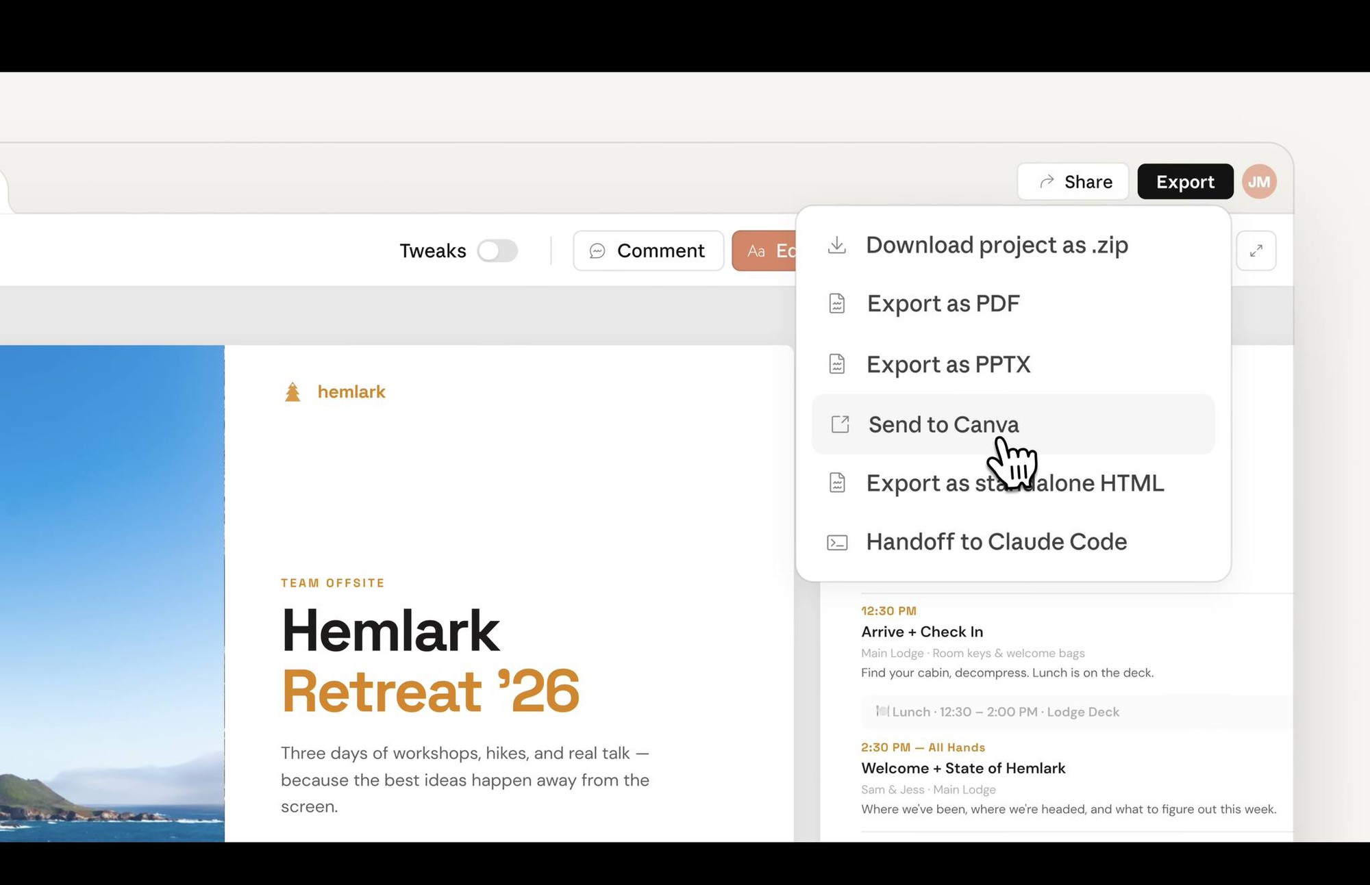 Tuy vậy, người dùng vẫn có các lựa chọn xuất dữ liệu khác bao gồm chia sẻ dưới dạng liên kết nội bộ, lưu thành thư mục, hoặc xuất sang Canva, PDF và các tệp HTML độc lập.