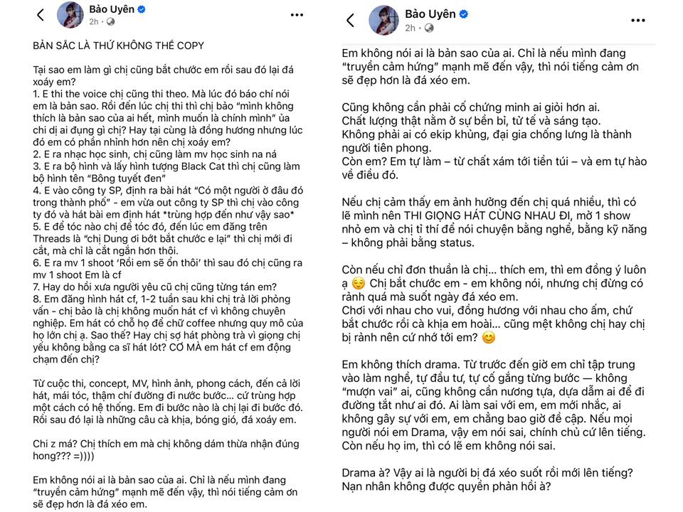 Bức tâm thư dài của Bảo Uyên trên fanpage khẳng định Juky San bắt chước từng đường đi nước bước của cô có chủ đích. Ngoài ra, còn nhắc đến chi tiết Juky San có “đại gia chống lưng”. Bảo Uyên gửi lời thách đấu đến Juky San, nói nếu muốn thì hãy thi hát với nhau, nói chuyện bằng nghề và kỹ năng.