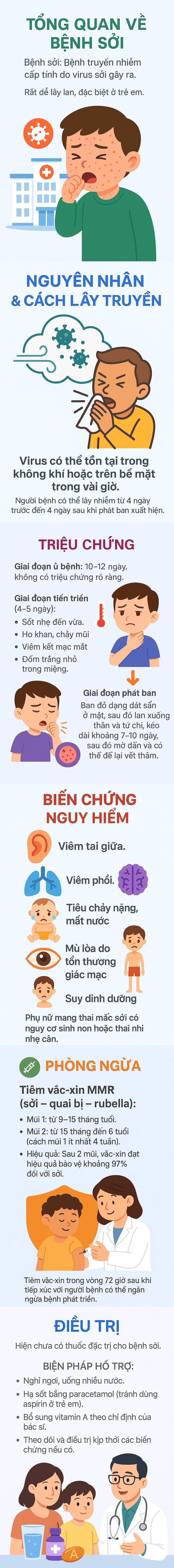 Từ đầu năm 2025 đến nay, tình hình dịch sởi tại Việt Nam diễn biến phức tạp với số ca mắc tăng cao so với cùng kỳ năm trước. Tính đến ngày 25/4/2025, cả nước ghi nhận 81.691 trường hợp nghi mắc sởi tại 63 tỉnh, thành phố. Đã ghi nhận ít nhất 5 trường hợp tử vong liên quan đến sởi trên cả nước, bao gồm cả trẻ em và người lớn có bệnh nền.