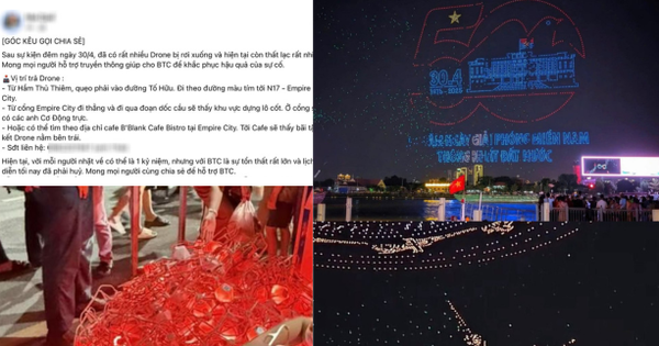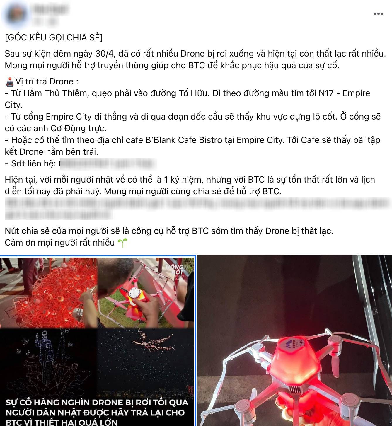 Chia sẻ với chúng tôi vào chiều ngày 1/5, anh Nguyễn Ngọc Thái, thuộc đơn vị đối tác của ban tổ chức trình diễn drone show tối 30/4, cho biết hiện phía ban tổ chức đã thu hồi gần đủ nhờ sự hỗ trợ của người dân.