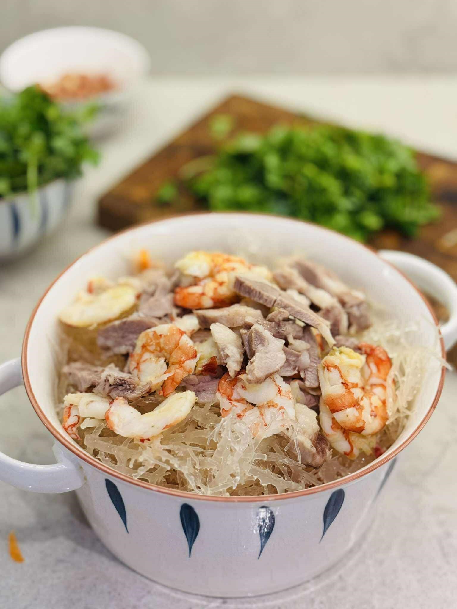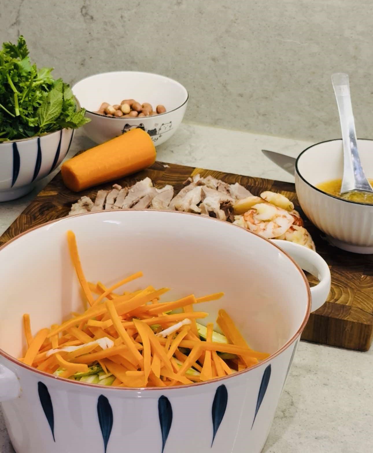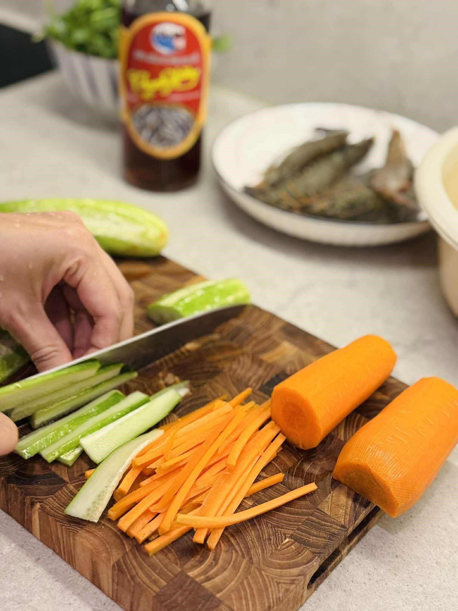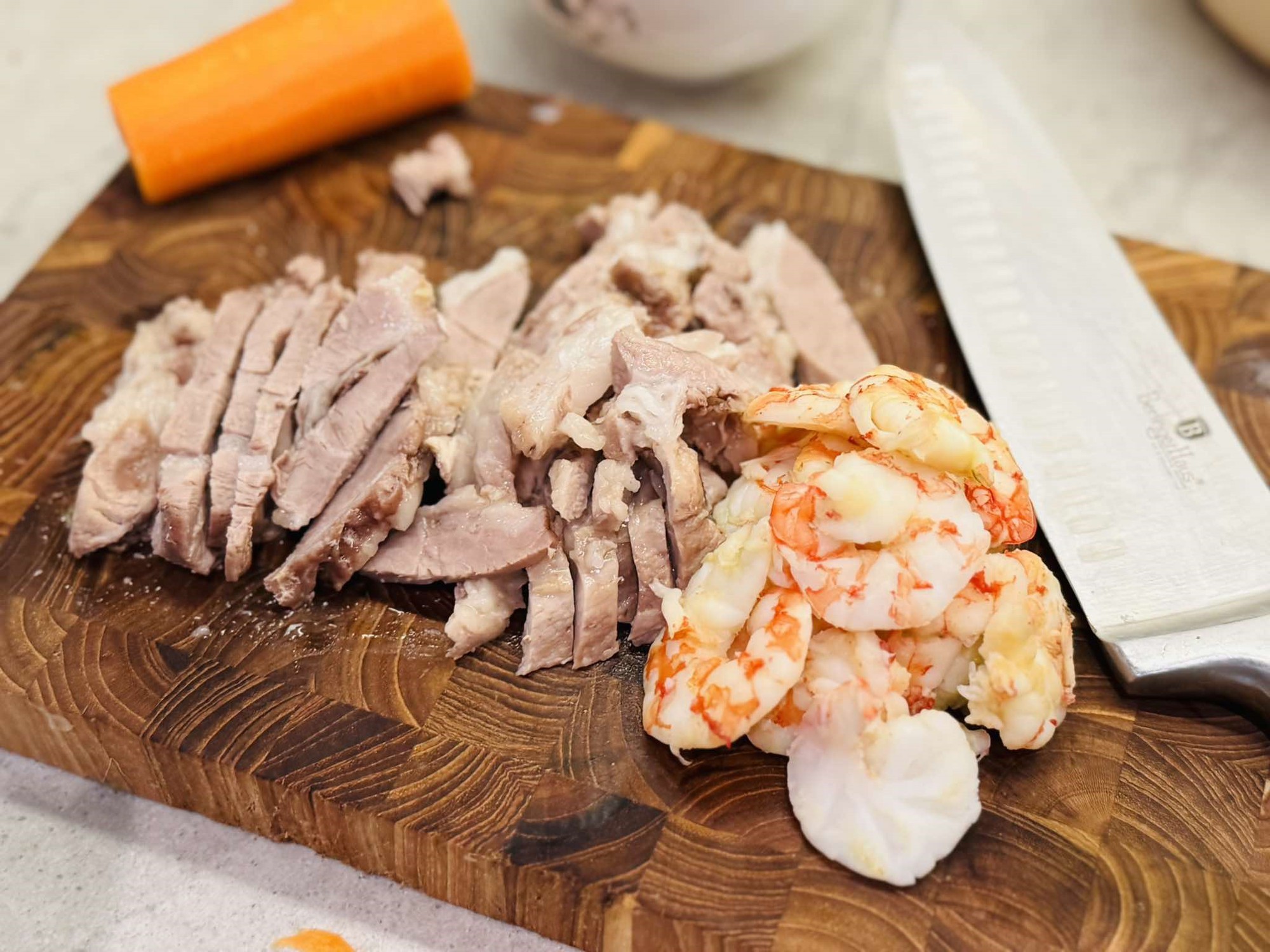 Bước 2: Thịt heo bạn rửa sạch sau đó cho vào nồi luộc chín. Tôm bóc bỏ vỏ, rút chỉ sống lưng rồi luộc chín. Sau khi tôm và thịt đã sẵn sàng, bạn thái thịt heo thành các miếng dạng dải vừa ăn. Dùng dao chẻ đôi tôm theo dọc sống lưng. Cà rốt bạn gọt bỏ vỏ, rửa sạch rồi thái sợi. Dưa chuột rửa sạch, ngâm nước muối để loại bỏ tạp chất rồi cắt thành các dải.