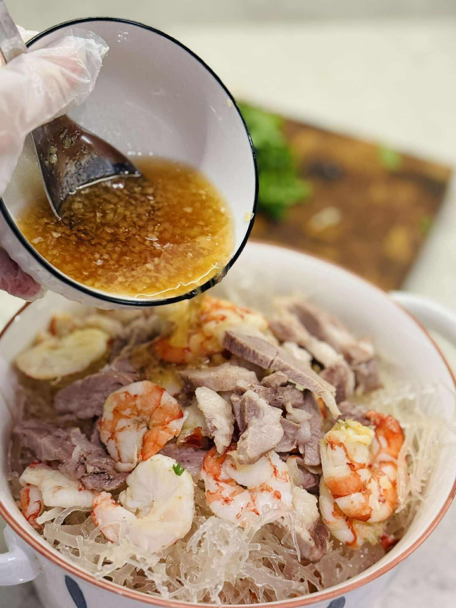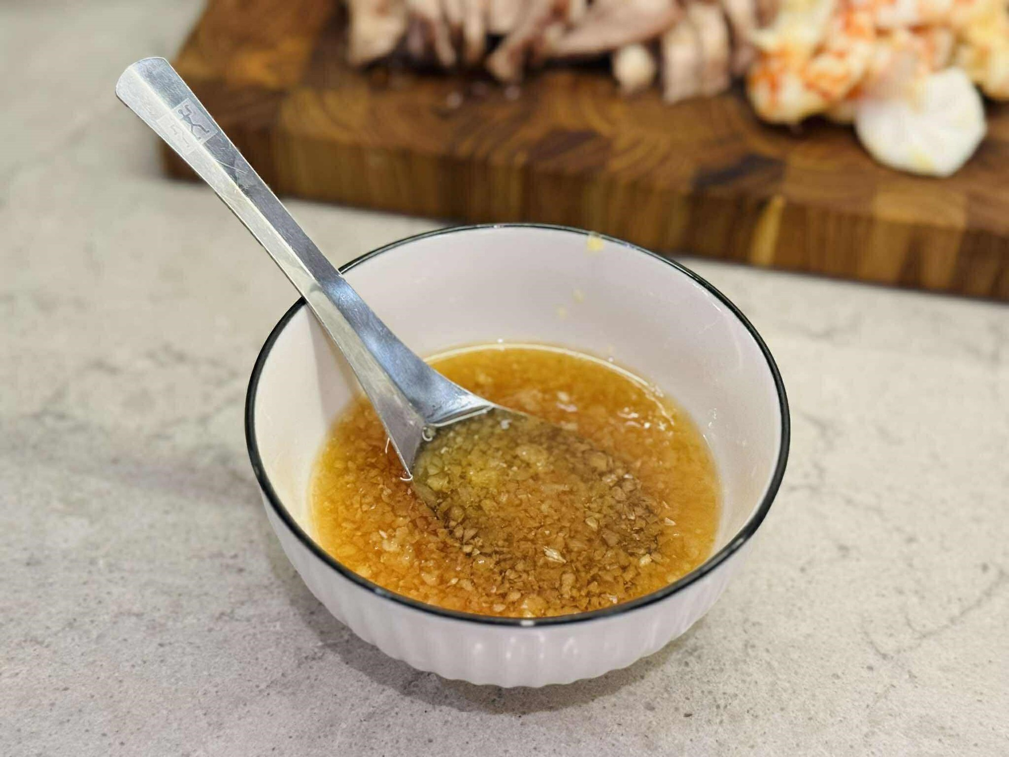 Bước 3: Chuẩn bị một chiếc bát, cho nước mắm, đường, giấm và nước vào (tỉ lệ sẽ là 1:1:1:2), khuấy đều cho đến khi đường tan hoàn toàn. Tiếp đó bạn cho tỏi băm vào, khuấy đều là hoàn thành nước sốt cho món trộn. Nếu thích ăn cay, bạn có thể cho một ít ớt băm vào. Khi đã hoàn thành nước sốt, bạn cho cà rốt, dưa chuột và rong sụn đã sơ chế vào âu trộn. Tiếp đó cho thịt heo và tôm vào.