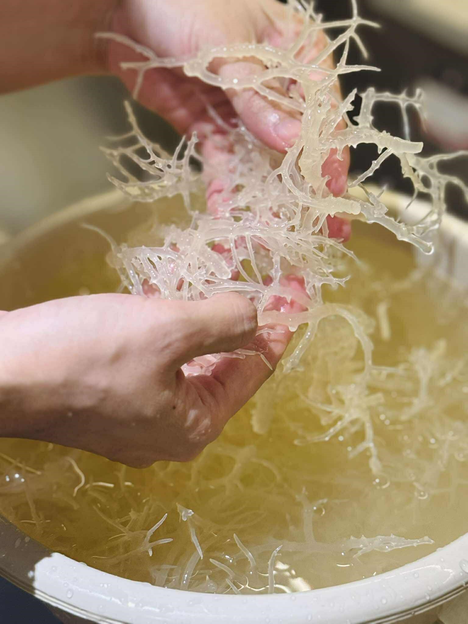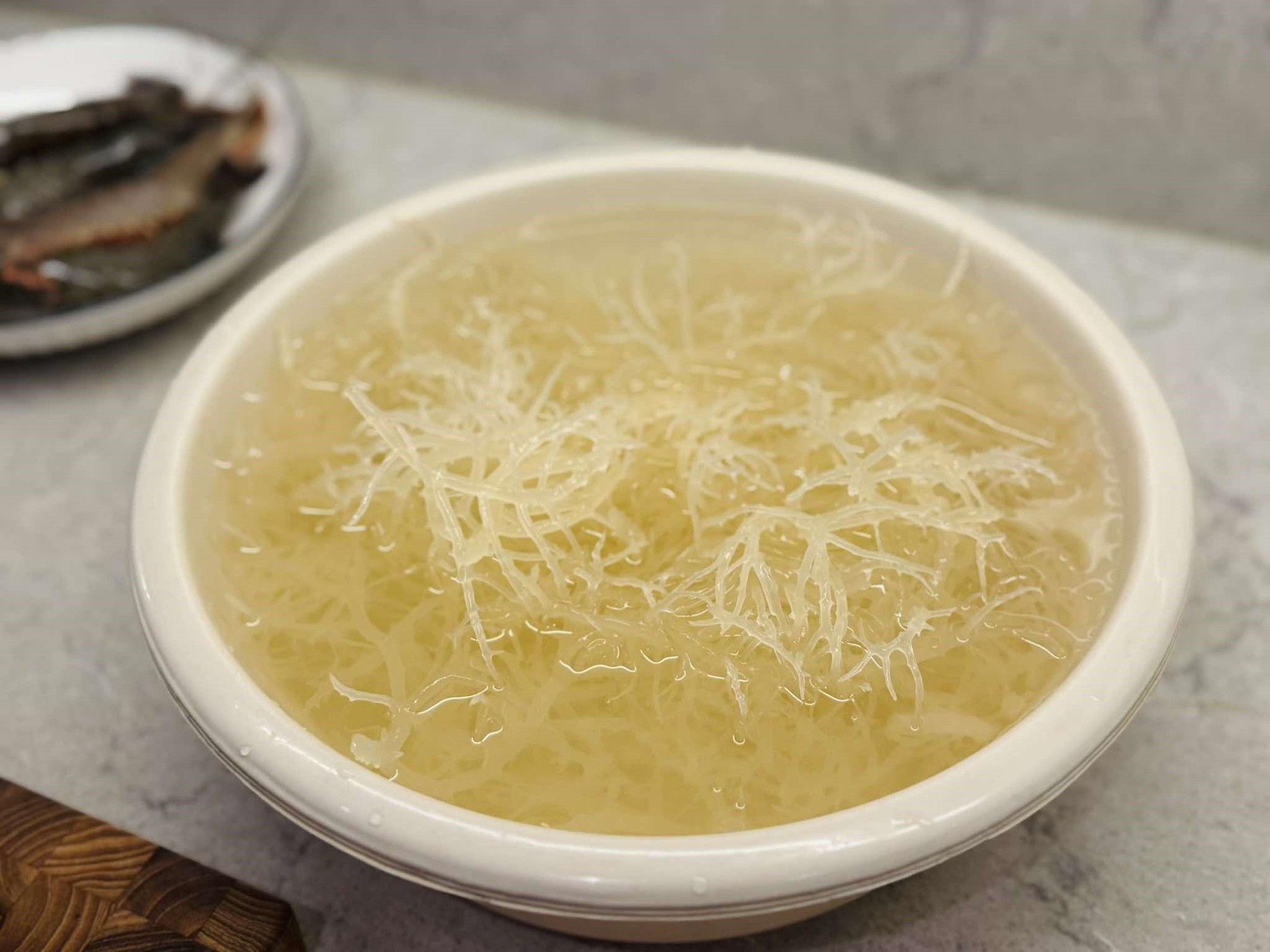 Lưu ý: Bạn có thể chần nhanh rong sụn trong nước nóng. Khi chần phải nhanh tay nếu không sẽ khiến rong sụn mềm, lớp collagen thực vật sẽ bị phá hủy, từ đó thành phẩm kém ngon.