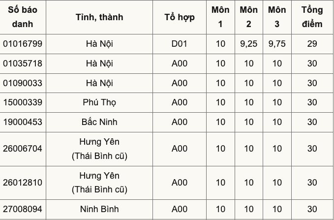 Hà Nội và TPHCM, Hưng Yên cùng có có 2 thủ khoa đạt điểm tuyệt đối. Trong khi đó Phú Thọ, Bắc Ninh và Ninh Bình đều có 1 thủ khoa.