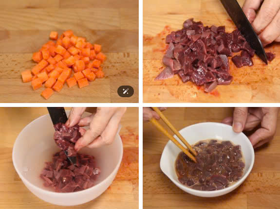 Gan heo rửa sạch, cắt nhỏ, ướp với một ít bột bắp và nước tương để mềm và khử mùi tanh. Đánh tan trứng gà. Phi thơm hành tím và tỏi băm, cho gan heo vào xào chín, vớt ra để riêng.