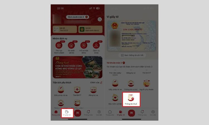 Bước 1: Mở ứng dụng VNeID và đăng nhập bằng tài khoản đã xác thực mức 2. Sau đó truy cập vào mục “Ví giấy tờ” và chọn phần tích hợp thông tin.