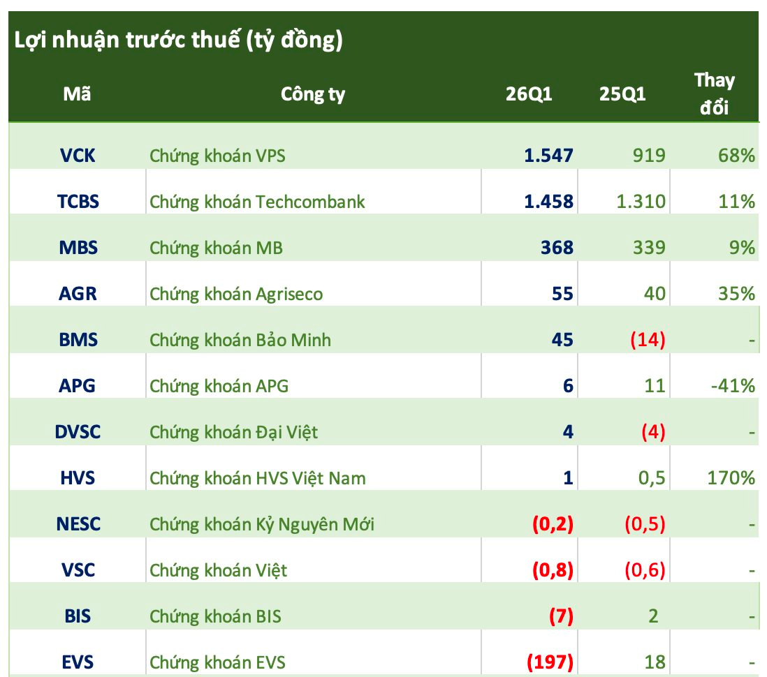 Tương tự, Chứng khoán Đại Việt báo lợi nhuận trước thuế hơn 4 tỷ đồng trong quý đầu năm, tích cực hoàn toàn so với mức lỗ 4 tỷ trong quý 1/2025.
