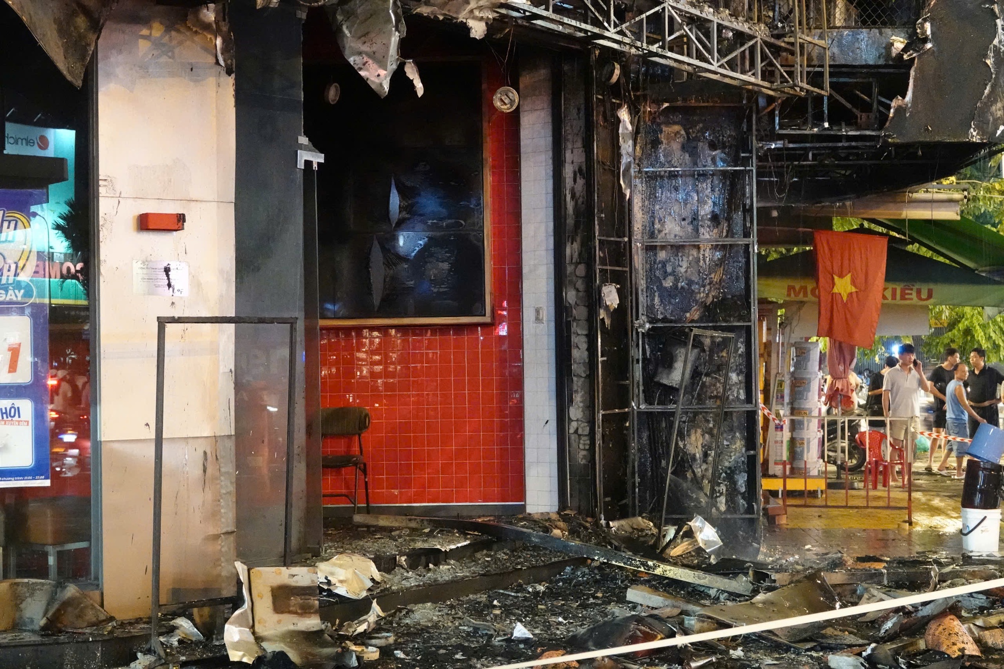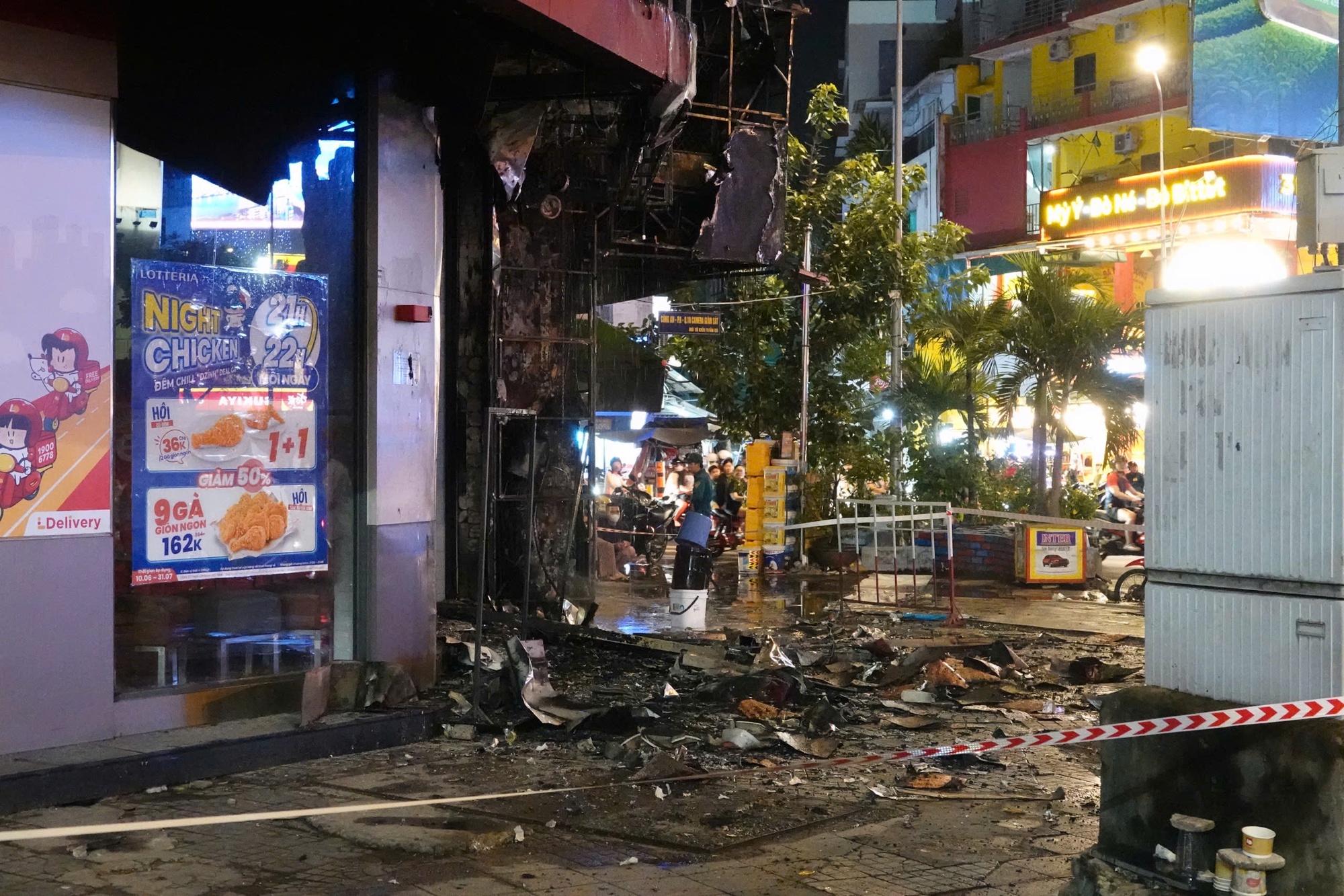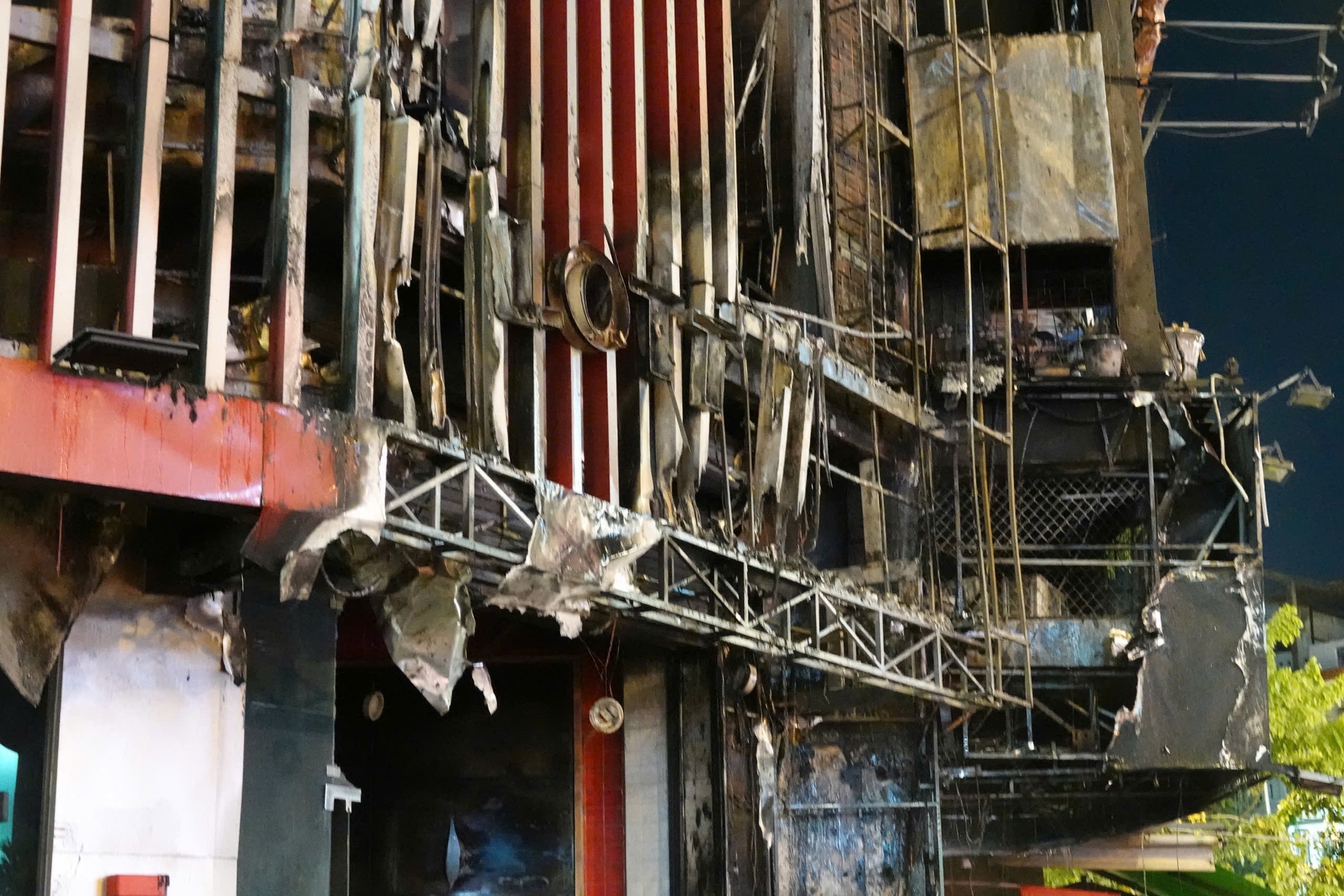 Theo quan sát, toàn bộ mặt tiền của toà nhà 5 tầng bị ngọn lửa thiêu rụi, nhiều mảng tường và nhựa nóng chảy văng tung tóe xuống dưới mặt đường khiến người dân không dám di chuyển gần. Các cục nóng điều hoà gần đó cũng bị ngọn lửa thiêu rụi, trơ khung.
