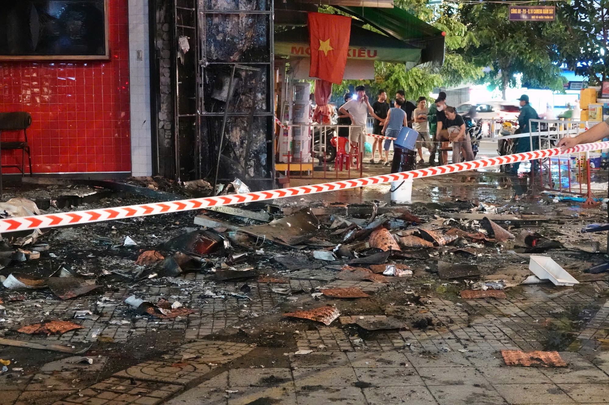 Nhiều mảng tường, mảnh nhựa… rơi xuống vương vãi khắp mặt đường sau khi vụ cháy được dập tắt