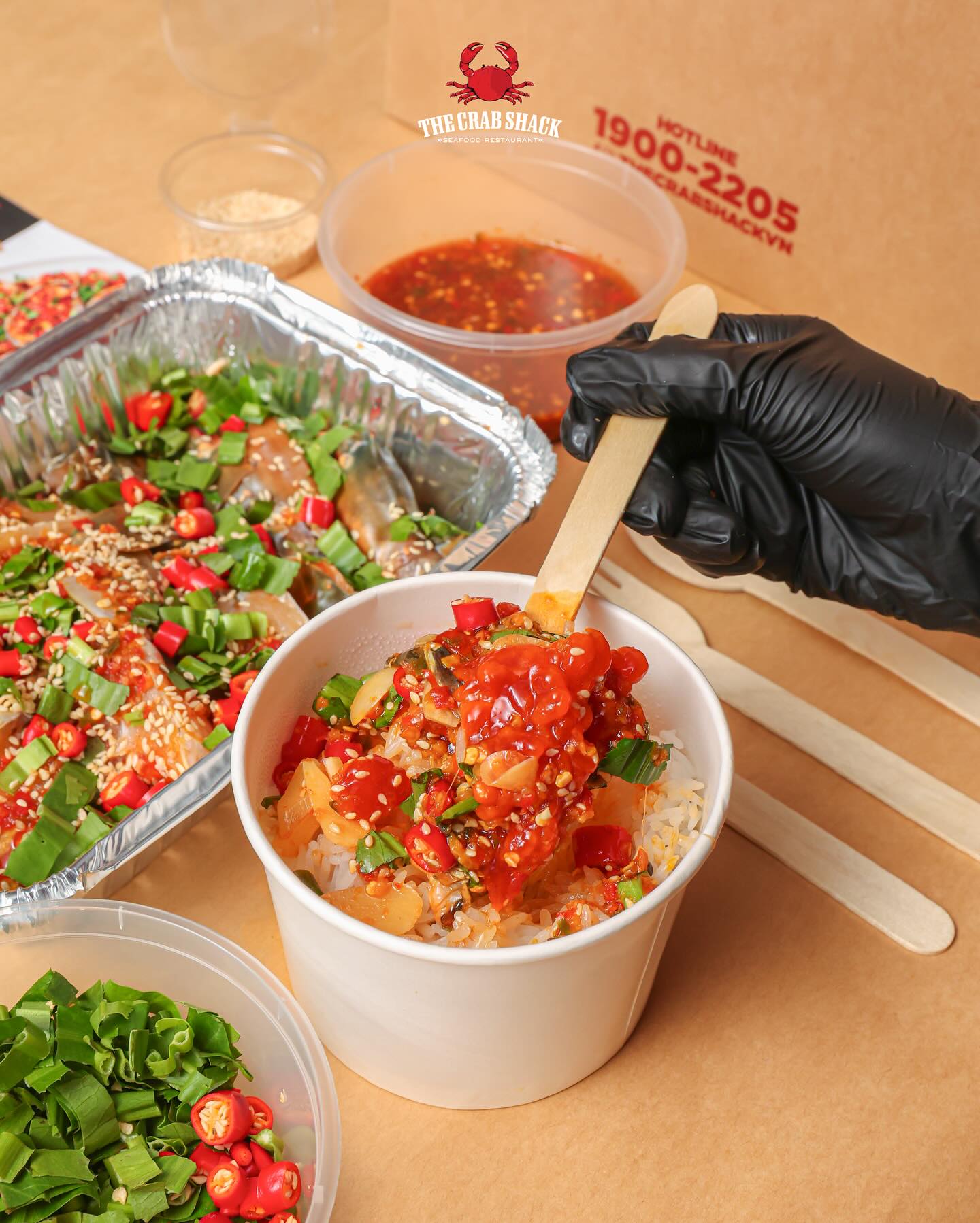 Về dịch vụ, cách phục vụ tại đây được chuẩn hóa rất tốt. Đặc thù của việc ăn hải sản xốt là rất dễ vấy bẩn ra quần áo nên nhà hàng đã tinh ý chuẩn bị sẵn yếm đeo cổ và bao tay tiện lợi cho từng khách. Đáng chú ý, thương hiệu này ghi điểm tuyệt đối với xu hướng tiêu dùng xanh. Thay vì sử dụng hộp nhựa dùng một lần rẻ tiền, các đơn hàng mang về đều được đóng gói bằng hộp giấy kraft cứng cáp, lót khay nhôm giữ nhiệt bên trong.