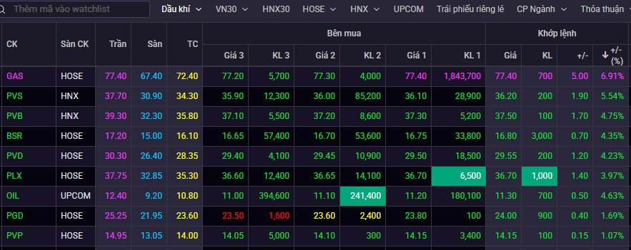 Đáng chú ý, dòng tiền đổ dồn vào cổ phiếu Tổng Công ty Khí Việt Nam – CTCP (PV GAS, mã: GAS). Lực mua áp đảo đẩy thị giá nhuộm “sắc tím” và ghi nhận tình trạng trắng bên bán. Nhờ đó, cổ phiếu dầu khí này tăng vọt lên mốc 77.400 đồng/cp cùng lượng dư mua giá trần đạt hàng triệu đơn vị. Vốn hóa thị trường đạt gần 186.000 tỷ đồng.