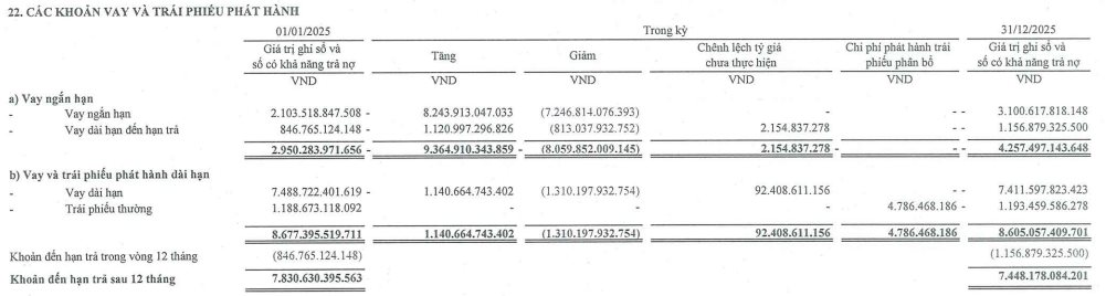 Đáng chú ý, vay tài chính chiếm tỷ trọng lớn 75% tổng dư nợ của công ty, với 11.705 tỷ đồng, tăng gần 1.000 tỷ đồng so với đầu năm. Cơ cấu vay bao gồm: Nợ vay ngắn hạn là 4.257 tỷ đồng, Vay và trái phiếu phát hành dài hạn là 7.448 tỷ đồng.