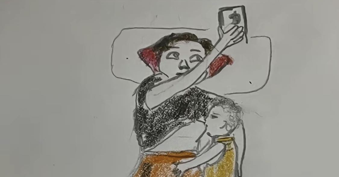 Mới đây, một bà mẹ chia sẻ bức tranh do con gái vẽ khiến cô không biết giấu mặt vào đâu. Trong tranh, mẹ đang nằm trên giường, quần áo xộc xệch, một tay giữ cho em bé bú, một tay cầm điện thoại lướt tin. Nhìn là biết ngay chuẩn những gì diễn ra trong đời thường. Mẹ nào có con nhỏ cũng bất giác thấy bản thân mình trong đó.