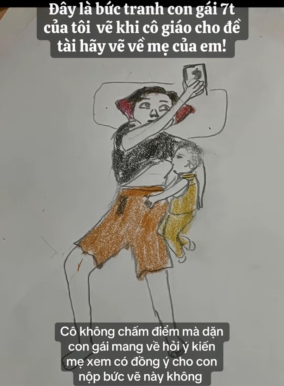 “Đây là bức tranh con gái 7 tuổi vẽ khi cô giáo cho đề tài hãy vẽ về mẹ của em. Cô không chấm điểm mà dặn con gái mang về hỏi ý kiến mẹ xem có đồng ý cho con nộp bức vẽ này không”, người mẹ chia sẻ.