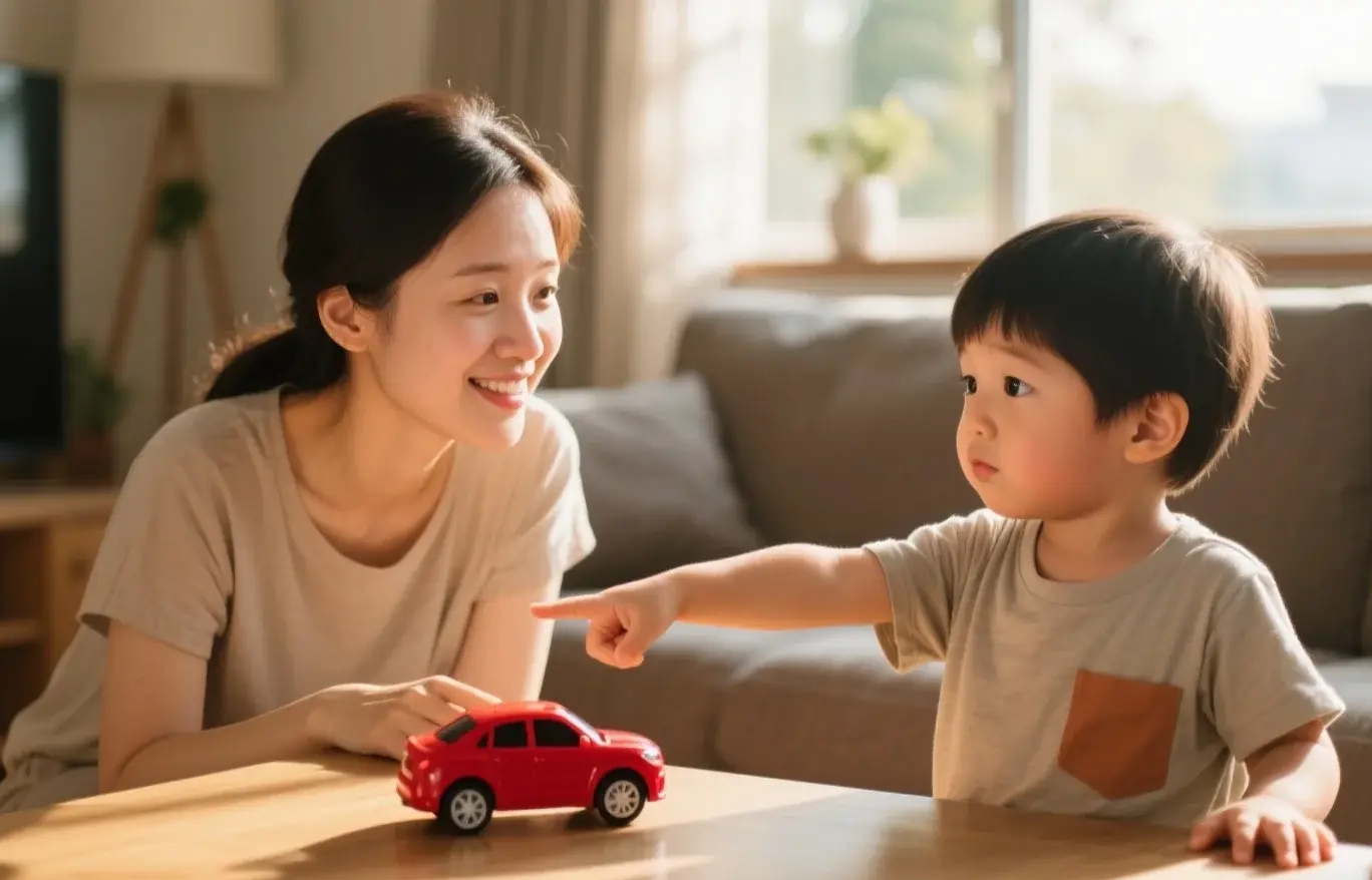 Con: “Xe màu xanh kìa” (trong khi là xe đỏ)
