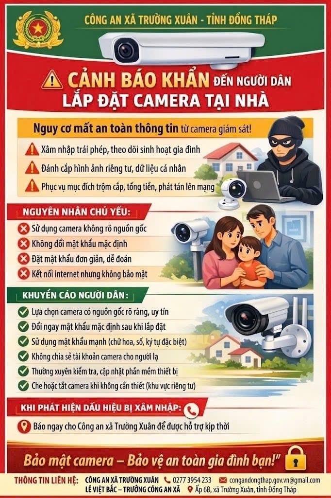Theo Công an xã Trường Xuân (tỉnh Đồng Tháp), thời gian gần đây, cơ quan chức năng ghi nhận nhiều hộ dân lắp đặt camera giám sát tại nhà nhưng chưa chú trọng đến các biện pháp bảo mật, tiềm ẩn nguy cơ mất an toàn thông tin.