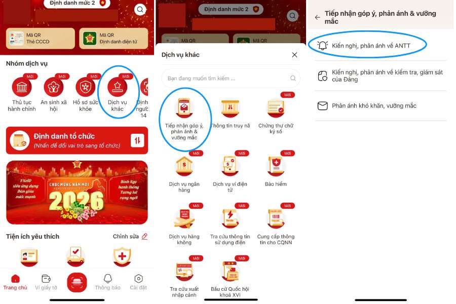 Để phản ánh, tố giác hành vi lừa đảo, vi phạm pháp luật trên VNeID, người dùng làm theo các bước sau: