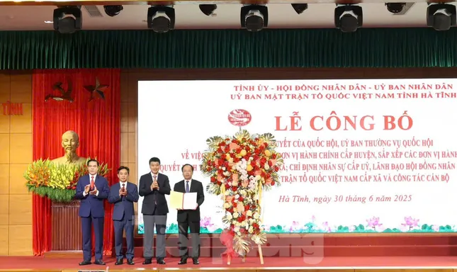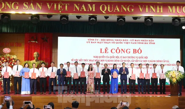 Sáng nay (30/6), tỉnh Hà Tĩnh tổ chức Lễ công bố Nghị quyết của Quốc hội, Ủy ban Thường vụ Quốc hội về việc kết thúc hoạt động đơn vị hành chính cấp huyện, sắp xếp các đơn vị hành chính cấp xã; quyết định thành lập đảng bộ cấp xã; chỉ định nhân sự cấp uỷ, lãnh đạo HĐND, UBND, ủy ban MTTQ cấp xã và công tác cán bộ.
