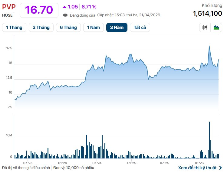 Trên thị trường, cổ phiếu PVP tăng trần trong phiên 21/4, chốt tại 16.700 đồng/cp với thanh khoản hơn 1,5 triệu đơn vị. Đây cũng là mức giá cao nhất của mã này trong khoảng 1,5 tháng trở lại đây.
