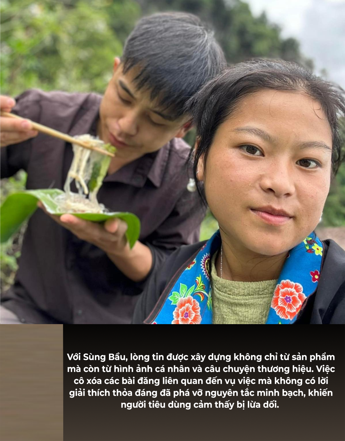 Người tiêu dùng ở thời điểm hiện tại, đặc biệt là những người mua hàng thông qua mạng xã hội, thường dựa vào sự minh bạch và tính xác thực để đưa ra quyết định. Với Sùng Bầu, lòng tin được xây dựng không chỉ từ sản phẩm mà còn từ hình ảnh cá nhân và câu chuyện thương hiệu. Việc cô xóa các bài đăng liên quan đến vụ việc mà không có lời giải thích thỏa đáng đã phá vỡ nguyên tắc minh bạch, khiến người tiêu dùng cảm thấy bị lừa dối. Họ bắt đầu tự hỏi liệu câu chuyện cảm hứng mà Sùng Bầu xây dựng có thật sự đáng tin cậy, hay chỉ là một chiêu trò?