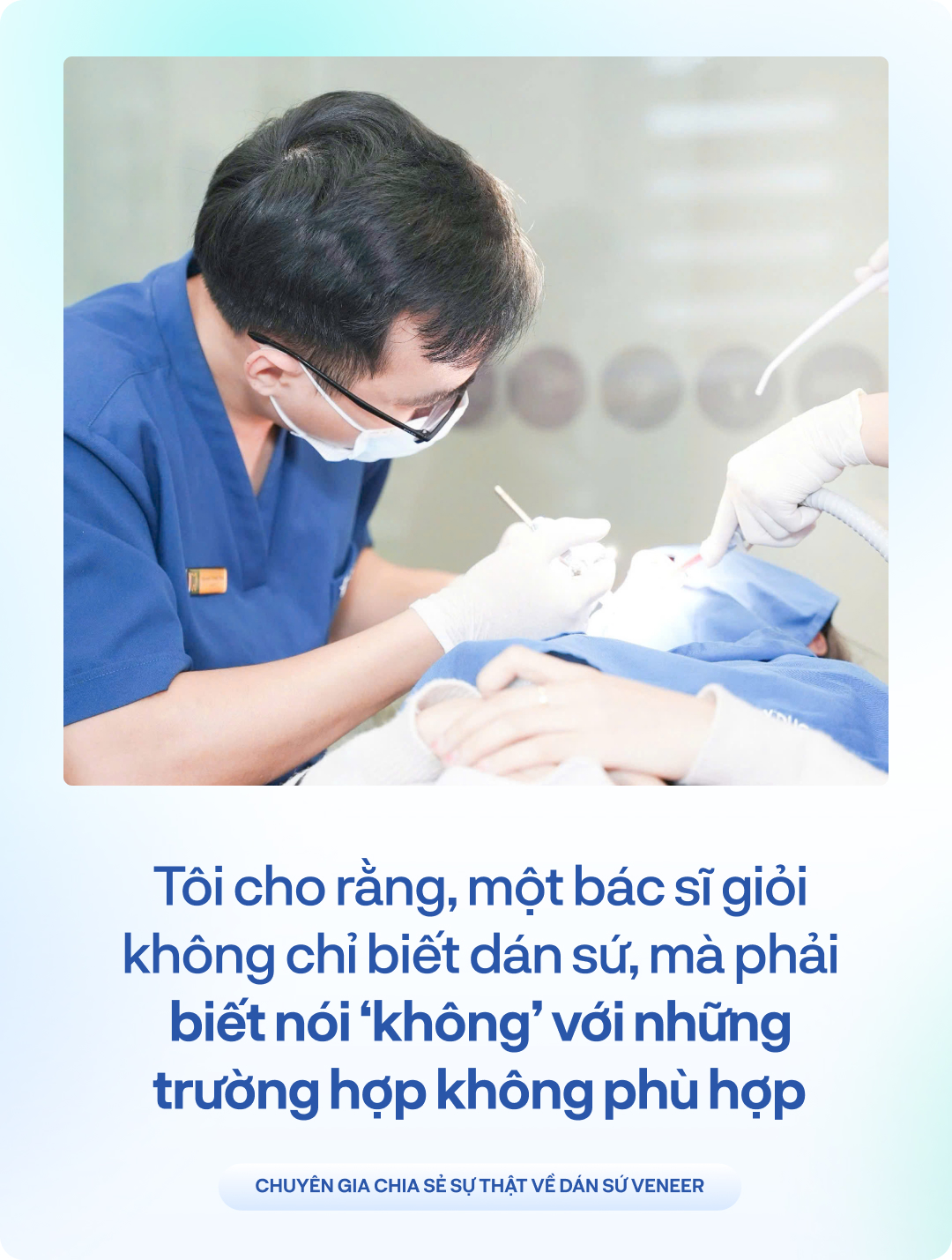 Tuy nhiên, không phải ai cũng phù hợp để dán sứ. Tôi thường khuyên khách hàng phải có răng thật ổn định, khớp cắn không sai lệch nặng, hiểu rõ mục đích làm đẹp, đừng chạy theo trào lưu.