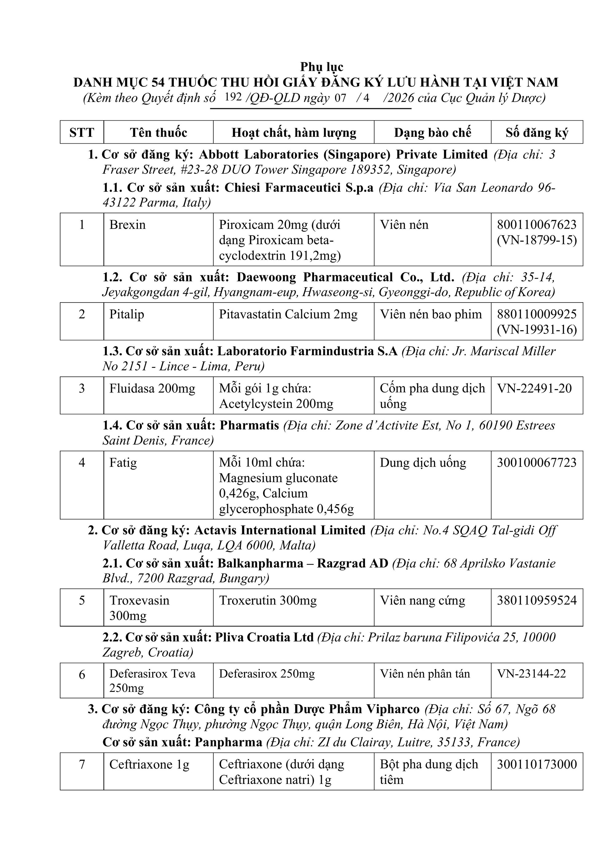 Ngày 8/4, Cục Quản lý Dược – Bộ Y tế ban hành Quyết định 192 thu hồi giấy đăng ký lưu hành của 54 loại thuốc theo đề nghị tự nguyện từ các cơ sở đăng ký.