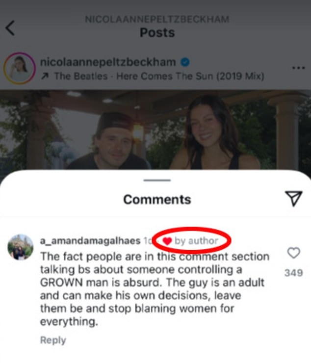 Phần bình luận bên dưới bài đăng mừng sinh nhật bố của Nicola Peltz trở thành “bãi chiến trường”. Rất nhiều người bình luận chỉ trích Brooklyn bất hiếu, trách móc Nicola thao túng và điều khiển chồng. Tuy nhiên, Nicola Peltz đã đáp trả bằng cách nhấn nút thích bình luận cho rằng Brooklyn Beckham tự đưa ra quyết định: “Thực tế là những người trong phần bình luận này nói rất vớ vẩn. Kiểm soát 1 người đàn ông TRƯỞNG THÀNH là vô lý. Anh chàng đó là người trưởng thành và có thể tự đưa ra quyết định, hãy để mặc đi và ngừng đổ lỗi cho phụ nữ về mọi thứ”. Như vậy, có thể thấy rằng Nicola đồng tình với quan điểm Brooklyn là người trưởng thành và có quan điểm riêng, cô hoàn toàn không thao túng hay điều khiển chồng.