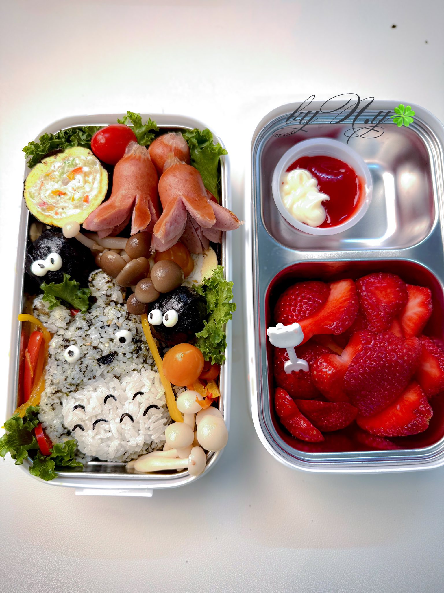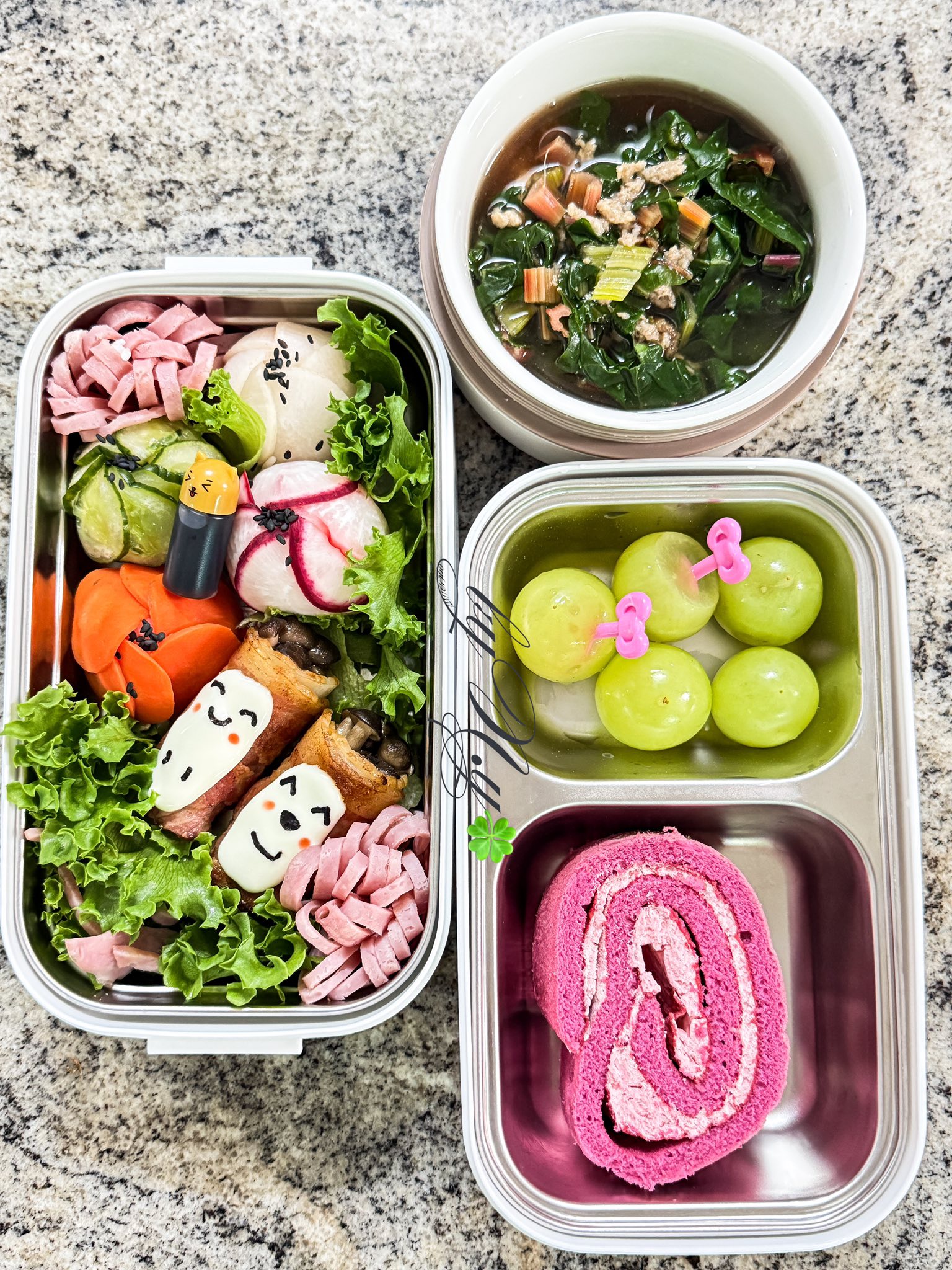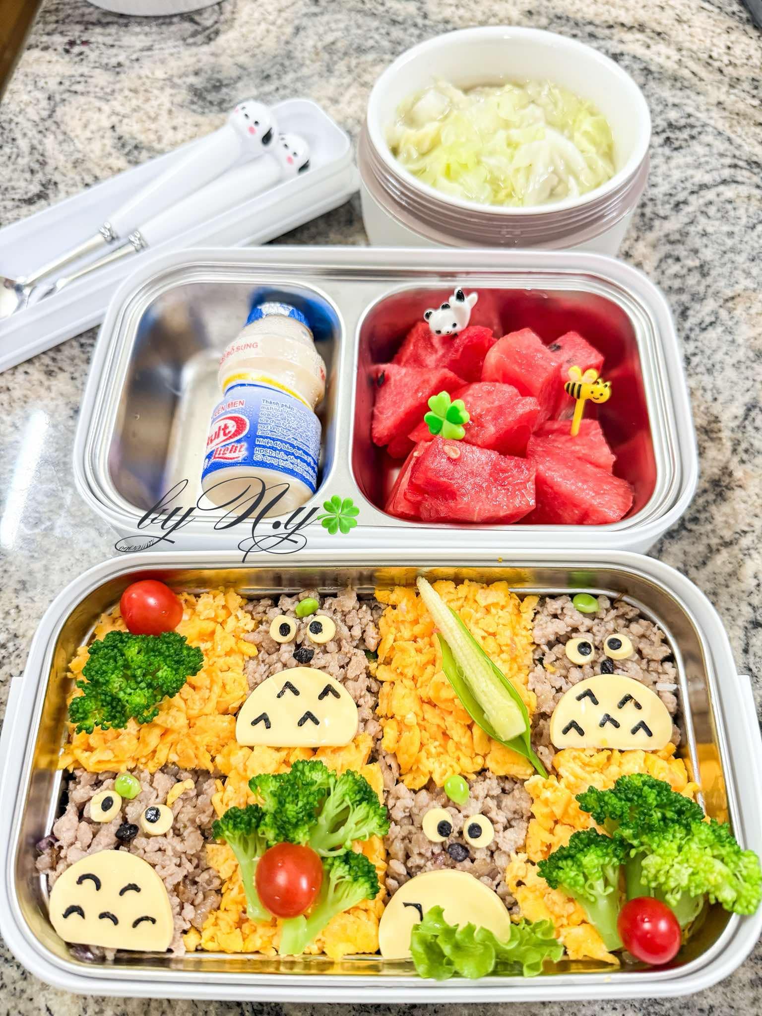 Mỗi ngày là một câu chuyện nhỏ được mẹ kể bằng thực phẩm: hôm nay là Cinnamoroll, mai lại là Totoro, hôm khác nữa là Kimbap gấu ngộ nghĩnh nằm giữa những nhánh súp lơ xanh và hạt bắp vàng rực.