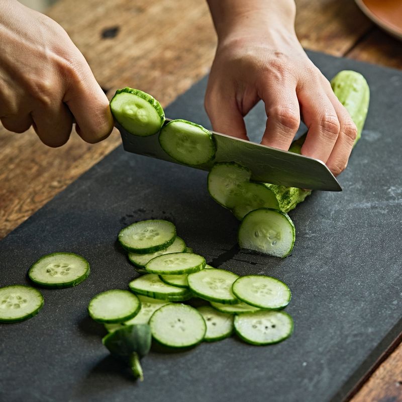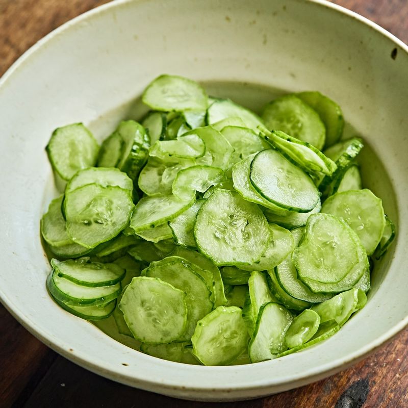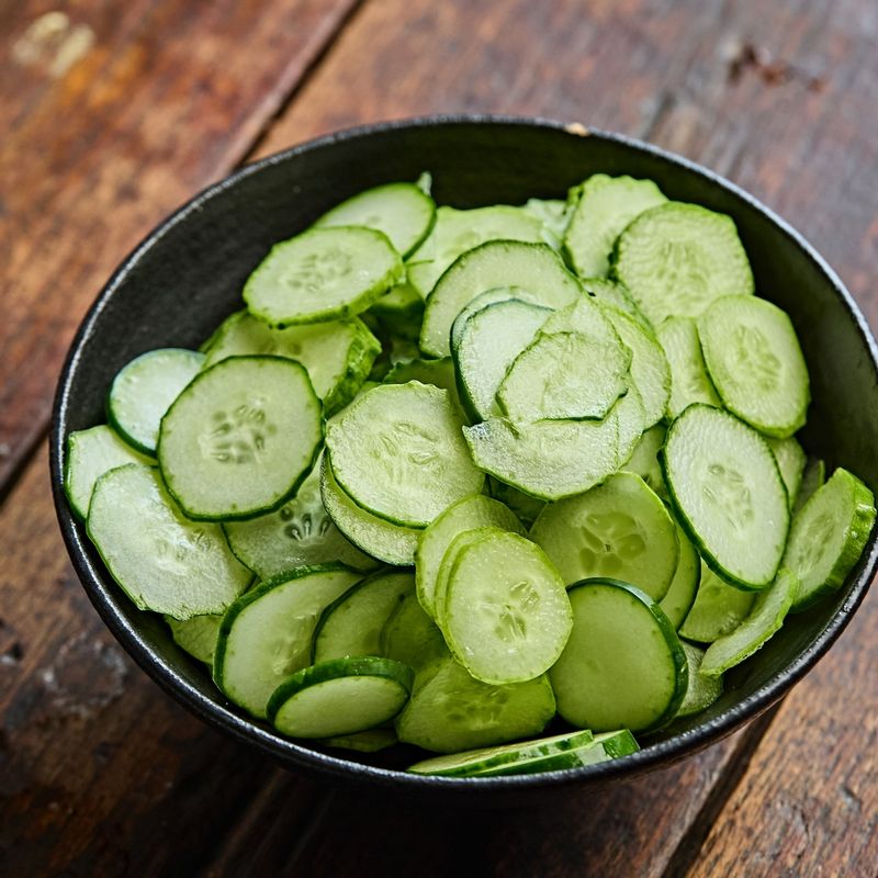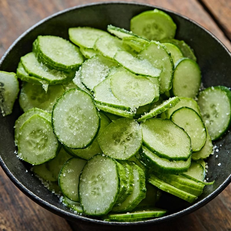 Bước 1: Dưa chuột bạn rửa sạch sau đó cho vào ngâm trong chậu nước có pha muối và backing soda để loại bỏ tạp chất cũng như dư lượng thuốc bảo vệ thực vật trên vỏ. Sau đó bạn xối rửa lại dưới vòi nước rồi để ráo. Tiếp theo thái dưa chuột thành các lát mỏng, cho vào bát tô. Sau đó rắc một chút muối lên dưa chuột và ướp trong 10 phút để dưa chuột tiết bớt nước. Sau 10 phút bạn nắm nhẹ để loại bỏ bớt nước trong dưa chuột rồi cho vào âu trộn.