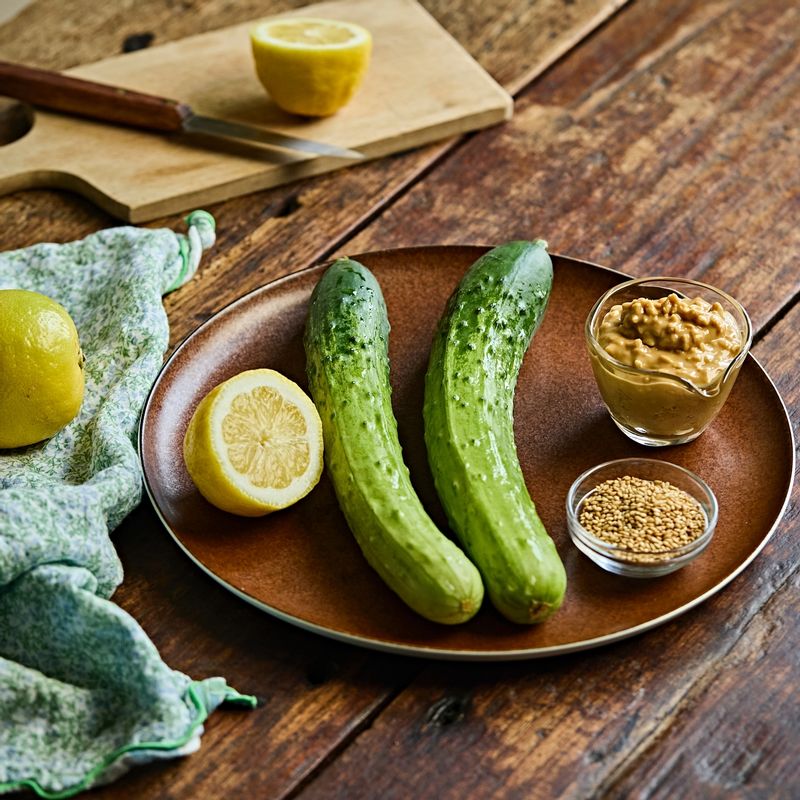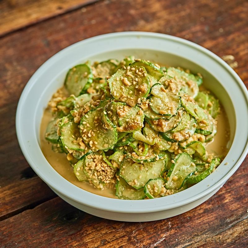 1-2 quả dưa chuột (tùy thuộc khẩu phần ăn), lượng muối vừa phải, 3 thìa canh bơ đậu phộng hạt giòn, 2 thìa canh mè rang, 1 thìa canh nước tương, 1/2 thìa canh đường, 1 thìa canh nước cốt chanh (hoặc giấm), một chút bột tiêu.