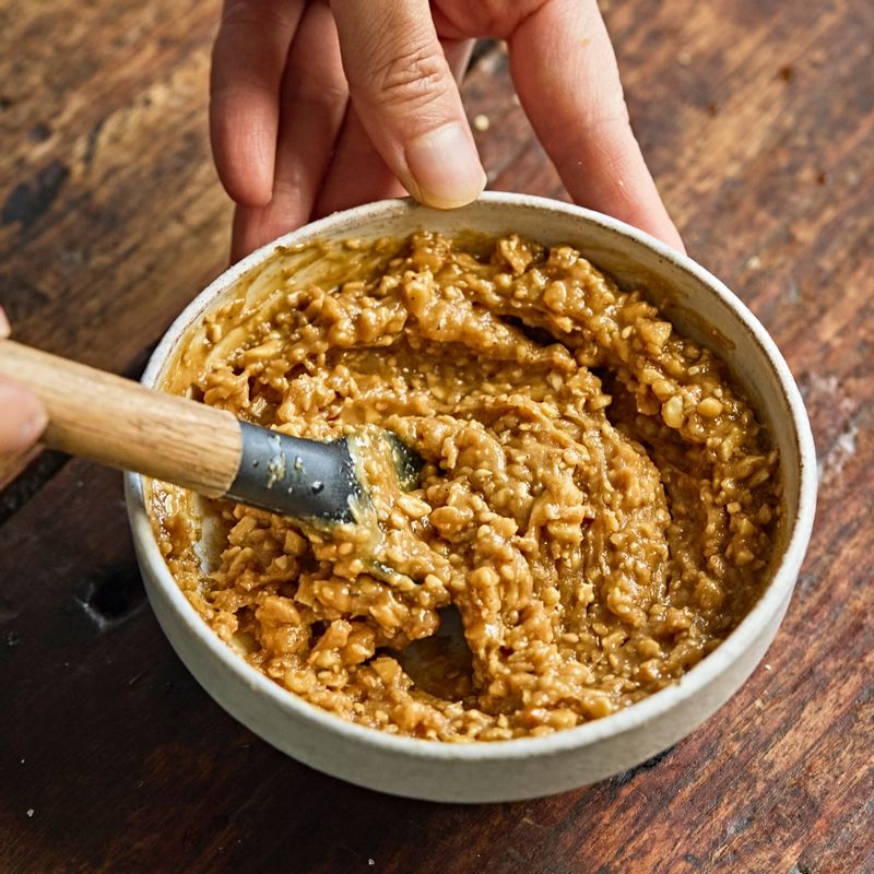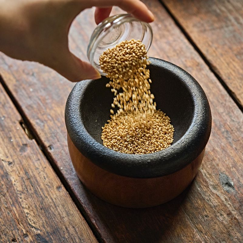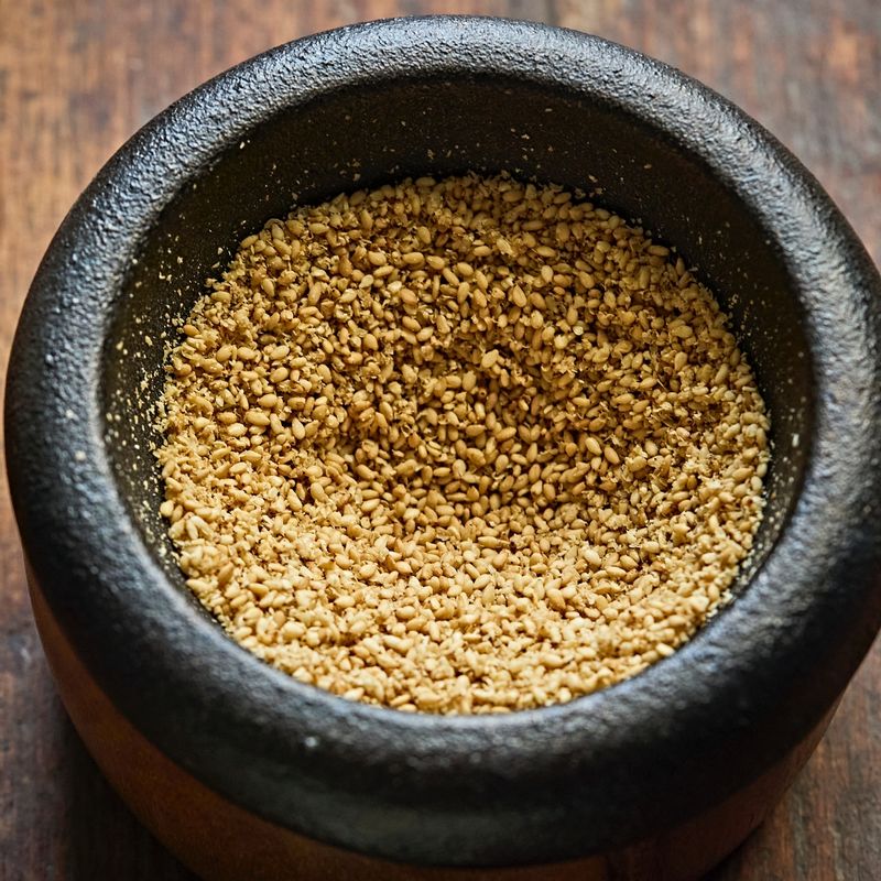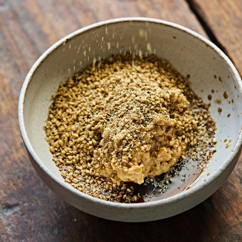 Bước 2: Bạn cho vừng rang vào cối, giã nhỏ. Tiếp theo chuẩn bị một chiếc bát, cho các nguyên liệu gồm vừng rang vừa giã, bơ đậu phộng hạt giòn, nước tương, đường, nước cốt chanh (hoặc giấm), một chút bột tiêu rồi dùng thìa trộn đều. Lưu ý, khi bạn giã vừng ra sẽ ngon hơn là để nguyên hạt.