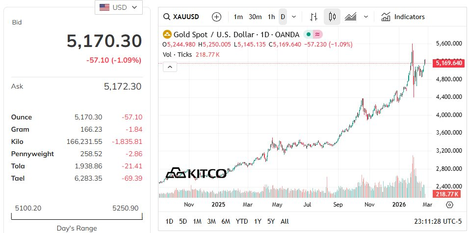 Nhìn sang vàng, theo dữ liệu từ sàn Kitco, giá vàng đang hồi phục tốt và hiện xoay quanh mốc 5.170 USD/ounce, tăng khoảng 17% so với đáy 3 tuần trước.
