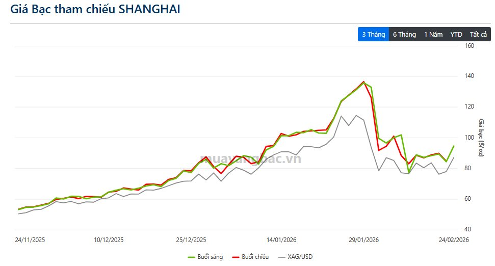 Theo cập nhật mới nhất từ muavangbac.vn, giá bạc vật chất tại Thượng Hải mở cửa phiên đầu tiên sau kỳ nghỉ Tết Nguyên đán (24/2) đã tăng vọt lên trên 94,6 USD/oz, tăng khoảng 20% từ đầu năm 2026, song vẫn thấp hơn đỉnh khoảng 30% hồi cuối tháng 1.