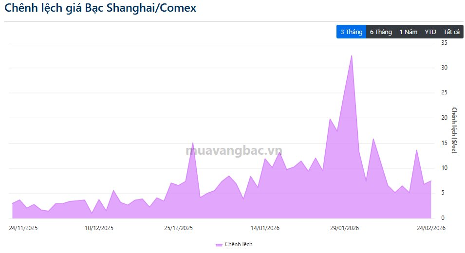 Chênh lệch giá bạc Thượng Hải so với giá bạc giao dịch trên sàn COMEX (Mỹ) đạt gần 7,5 USD/oz, thu hẹp đáng kể so với trước.