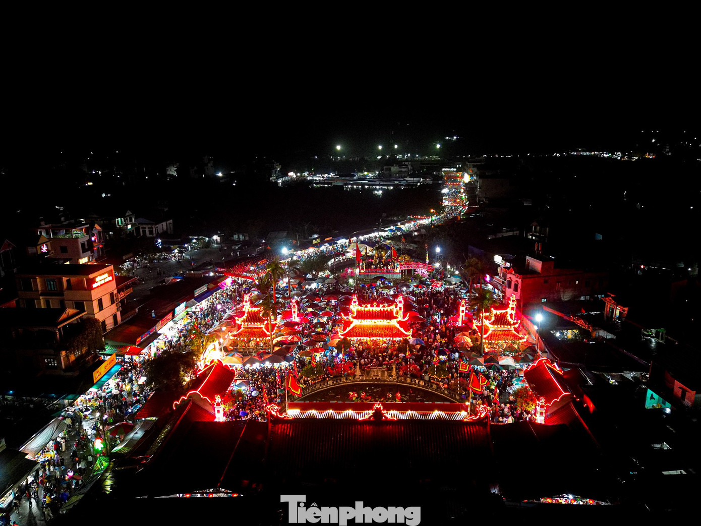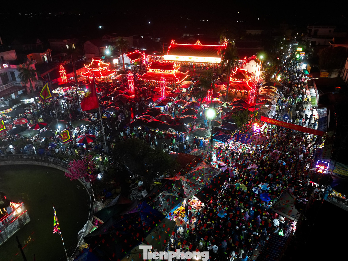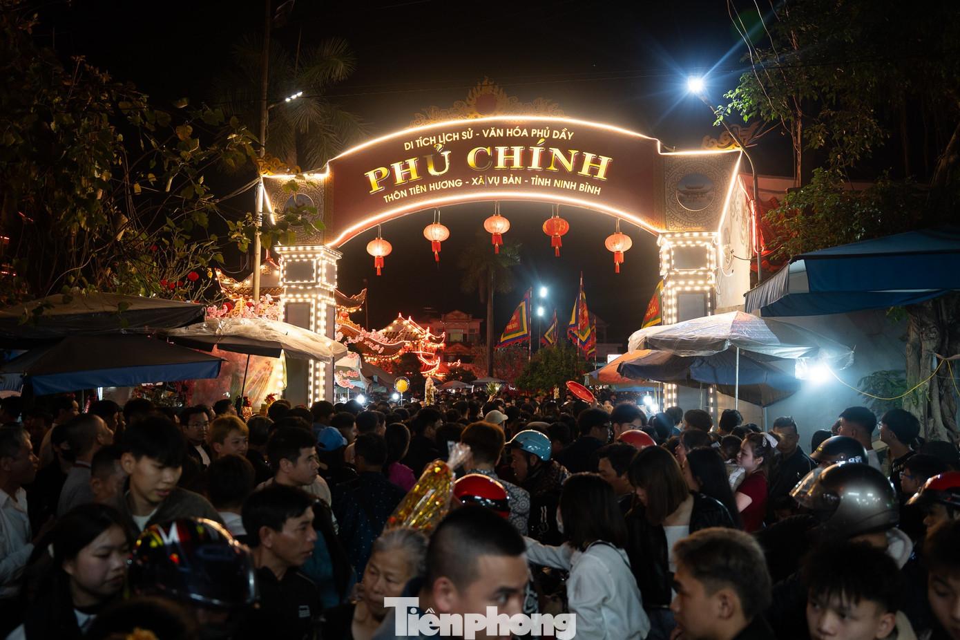 Các ngả đường dẫn vào quần thể di tích lịch sử, văn hóa Phủ Dầy – nơi tổ chức chợ Viềng xuân 2026, ken đặc người, dòng người chen chân giữa ánh đèn điện và những gian hàng san sát.