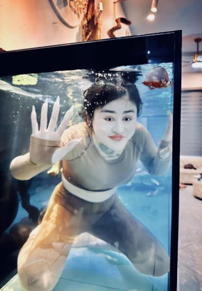 Hình ảnh Ngân baby giả thành nàng tiên cá bơi lội trong bể nước