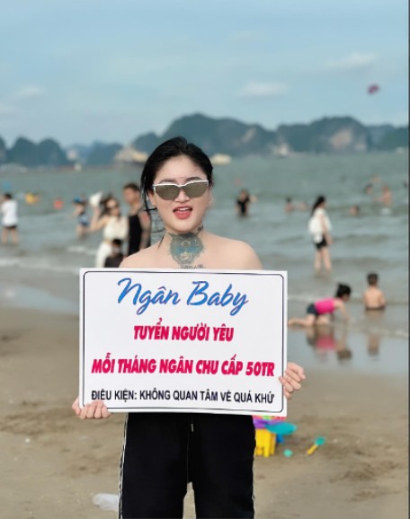 Dù nhận về nhiều phản ứng trái chiều từ cộng đồng mạng, nhưng sau đó Ngân Baby tiếp tục gây tranh cãi khi đứng giữa bãi biển cầm bảng “tìm người yêu” vào tháng 8/2023. Đáng chú ý, nội dung trong tấm bảng này, Ngân Baby mạnh dạn đưa ra quyền lợi cho ai làm người yêu của cô, đó chính là được cô chu cấp 50 triệu đồng mỗi tháng. Điều kiện mà Ngân Baby đưa ra là, chỉ cần không quan tâm đến quá khứ của cô.