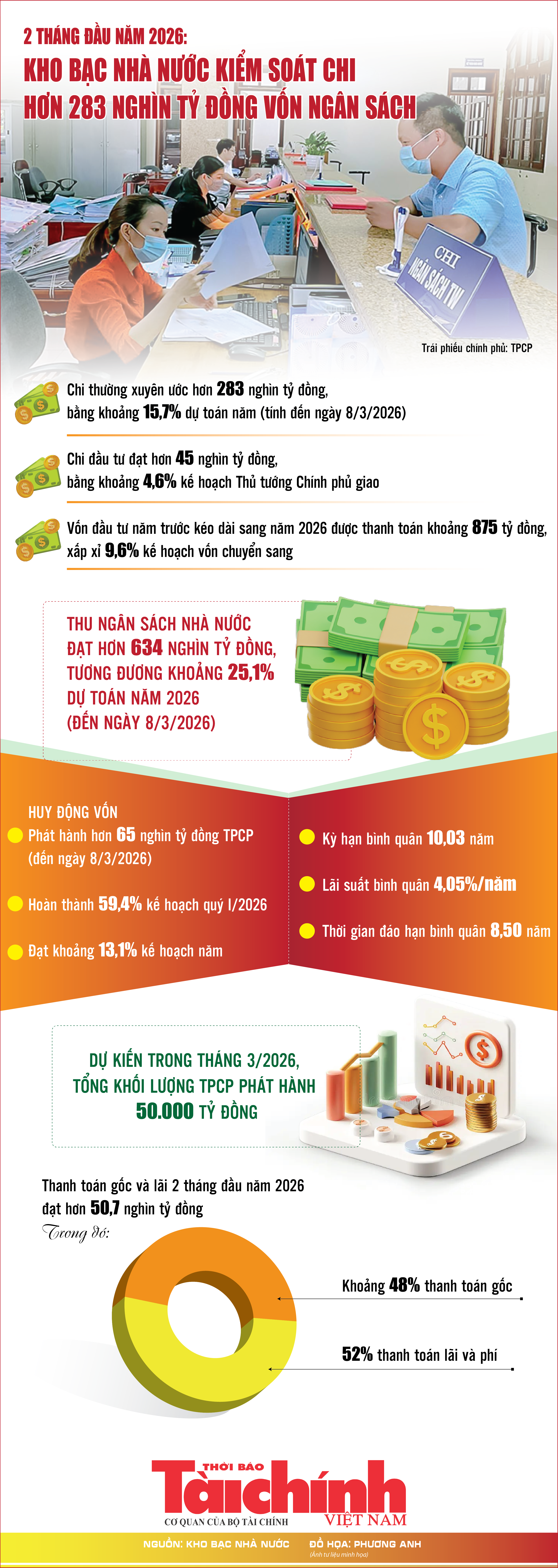 (TBTCO) – Theo Kho bạc Nhà nước, tính đến hết ngày 8/3/2026, toàn hệ thống đã kiểm soát và thanh toán chi thường xuyên đạt hơn 283 nghìn tỷ đồng, tương đương khoảng 15,7% dự toán chi thường xuyên năm 2026 (không bao gồm chi trả nợ, viện trợ, chi bổ sung quỹ dự trữ tài chính và dự phòng).