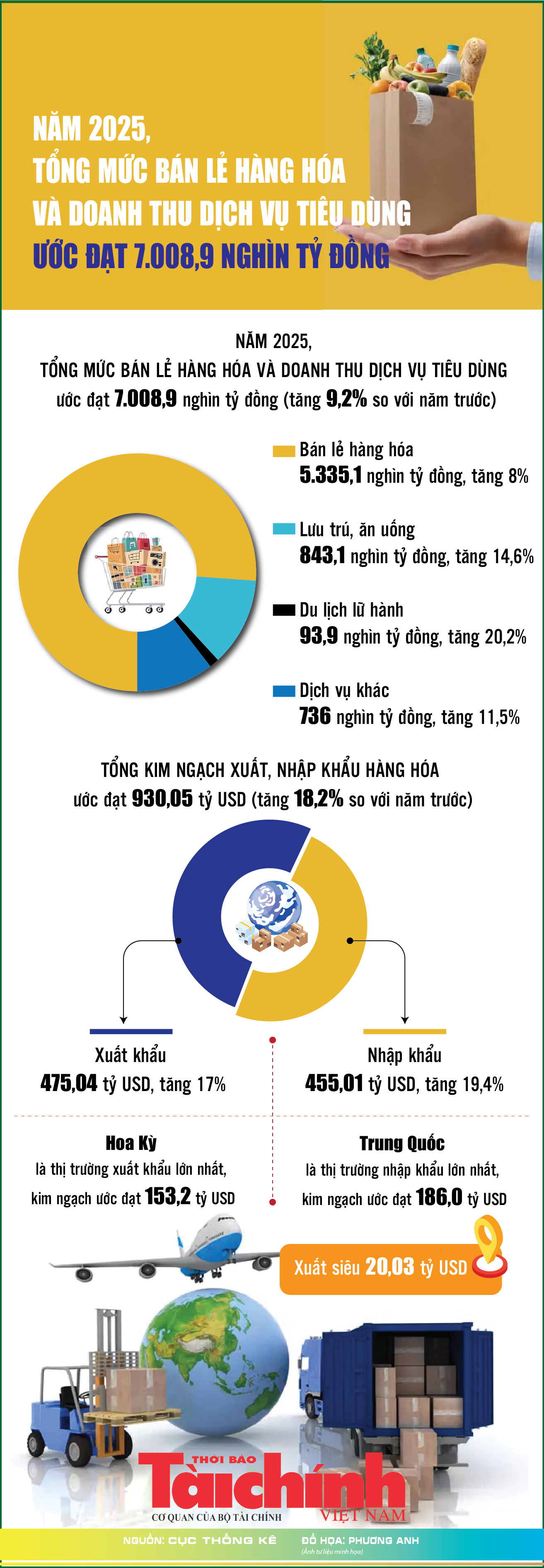 (TBTCO) – Theo Cục Thống kê (Bộ Tài chính), năm 2025, tổng mức bán lẻ hàng hóa và doanh thu dịch vụ tiêu dùng theo giá hiện hành ước đạt 7.008,9 nghìn tỷ đồng, tăng 9,2% so với năm trước.