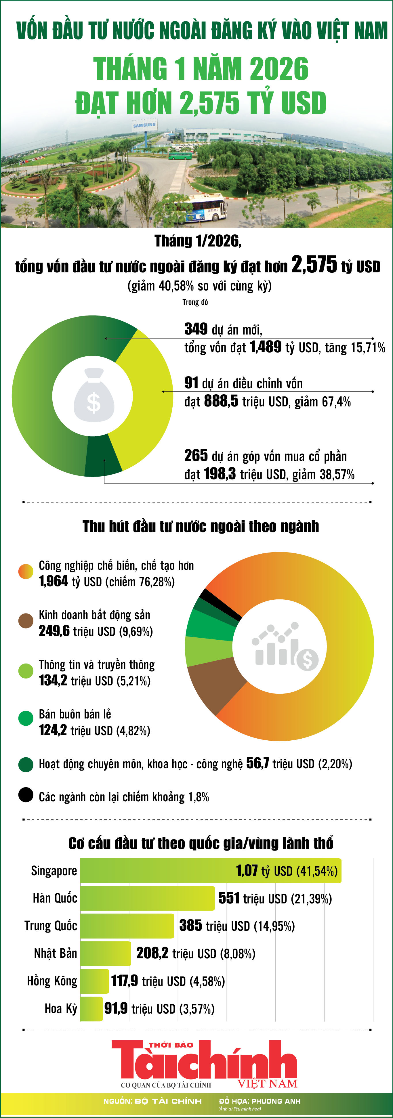 (TBTCO) – Theo Cục Thống kê (Bộ Tài chính), trong tháng 1/2026, Việt Nam tiếp tục thu hút dòng vốn đầu tư trực tiếp nước ngoài với tổng giá trị đăng ký đạt hơn 2,575 tỷ USD, giảm 40,58% so với cùng kỳ năm 2025.