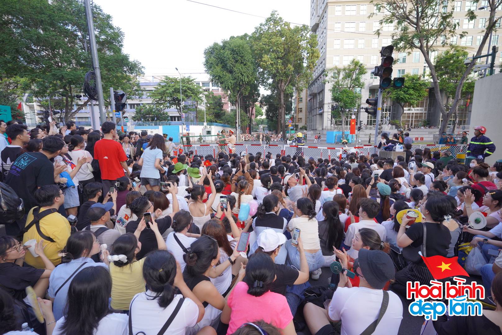 Ngay từ đầu giờ chiều nay, hàng dài người dân đã tập trung xếp hàng quanh khu vực Lê Duẩn để “giữ chỗ” theo dõi sự kiện. Thời tiết TP.HCM hôm nay khá nắng và hơi nóng, thế nhưng chẳng ai nản lòng. Đáng chú ý nhất là sự xuất hiện của rất đông du khách nước ngoài cùng hoà chung không khí rộn ràng với người dân Việt Nam.
