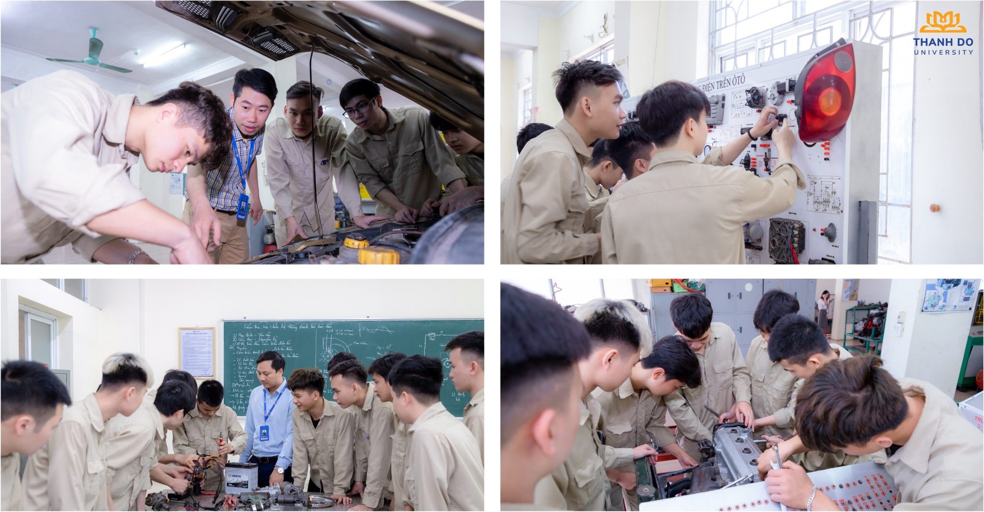 Đối với ngành Công nghệ Thông tin và Kỹ thuật Ô tô, sinh viên được “làm thật, học thật” trong các phòng thực hành mạng, phần cứng, lập trình, hay tại xưởng ô tô được trang bị từ A-Z, từ động cơ đốt trong đến hệ thống điện tử và chẩn đoán hiện đại.