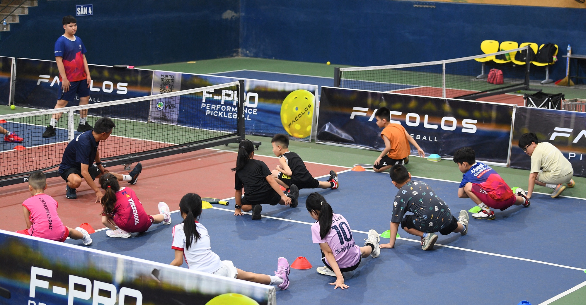 Từ 8h sáng, một lớp học pickleball cho trẻ em tại Hà Nội đã đông kín các tay vợt nhí. Bắt đầu từ những bài khởi động chung, làm nóng người với các động tác bổ trợ kỹ năng di chuyển, thể lực,… sau đó gần 20 học viên sẽ được chia thành 3 sân, sắp xếp theo độ tuổi và trình độ của mỗi học viên.