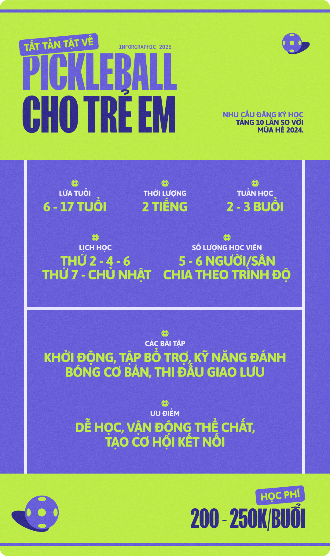 “Thực tế có thể thấy mùa hè năm nay các phụ huynh biết đến và quan tâm nhiều hơn đến việc đưa con đi học pickleball bài bản. So với năm ngoái, số lượng phụ huynh đăng ký học phải tăng gấp 10 lần. Ngoài ra cũng nhiều sân, câu lạc bộ và các HLV cũng đều hướng đến “khối nghỉ hè” để mở lớp đào tạo. Vừa giúp các bạn vận động, vừa tạo sân chơi mùa hè cho các bạn nhỏ. Thậm chí, nếu phát hiện tài năng có năng khiếu có thể chọn lọc, đào tạo nâng cao 1:1 để tham gia các giải đấu”, HLV Lê Long chia sẻ.